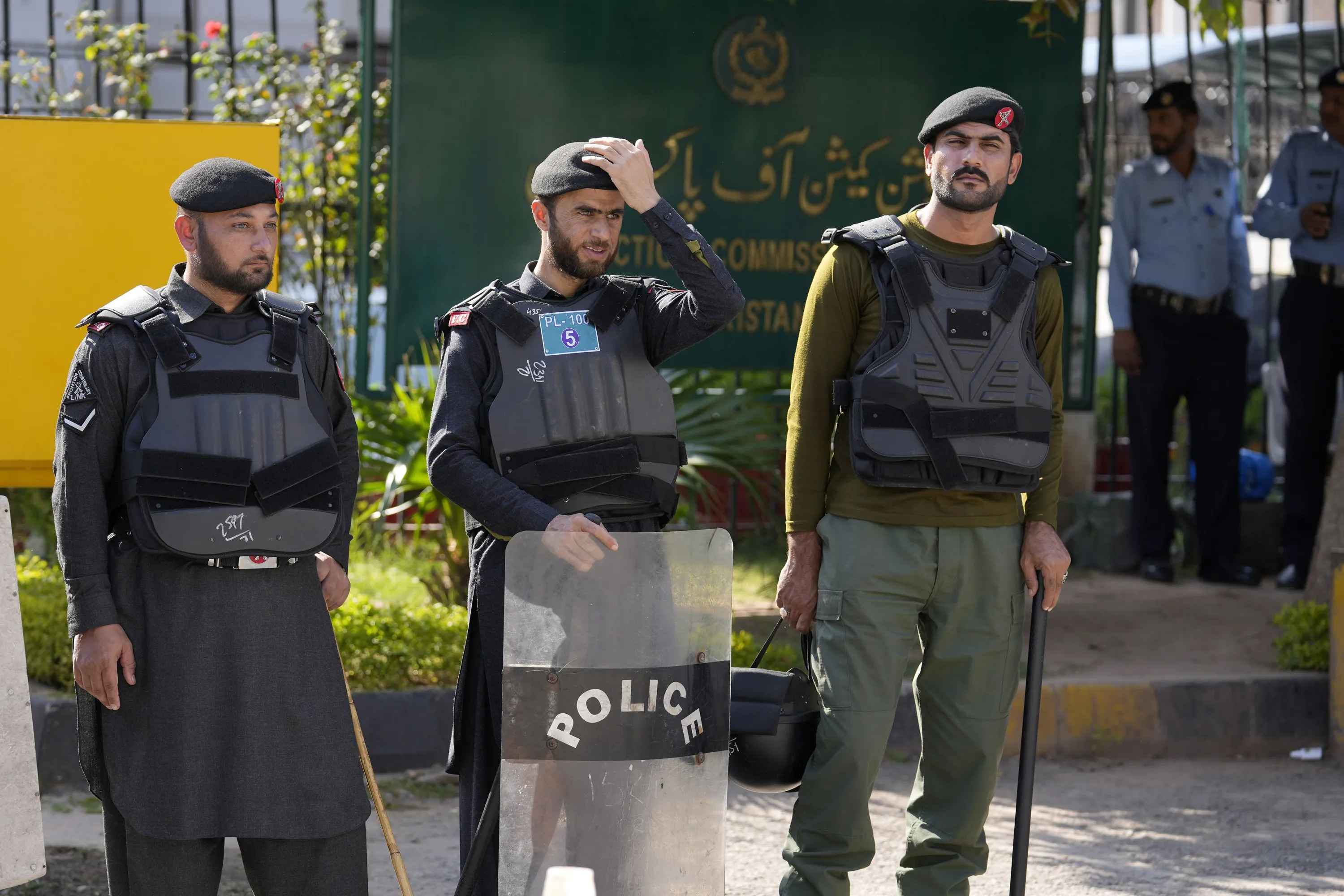 Police officers stand guard at the main entrance of the Election Commission head office in Islamabad, Pakistan, Friday, October 21, 2022. The elections commission on Friday disqualified Khan from holding public office on charges of unlawfully selling state gifts to him and concealing assets, his spokesman said. (Photo by Anjum Naveed/AP Photo)