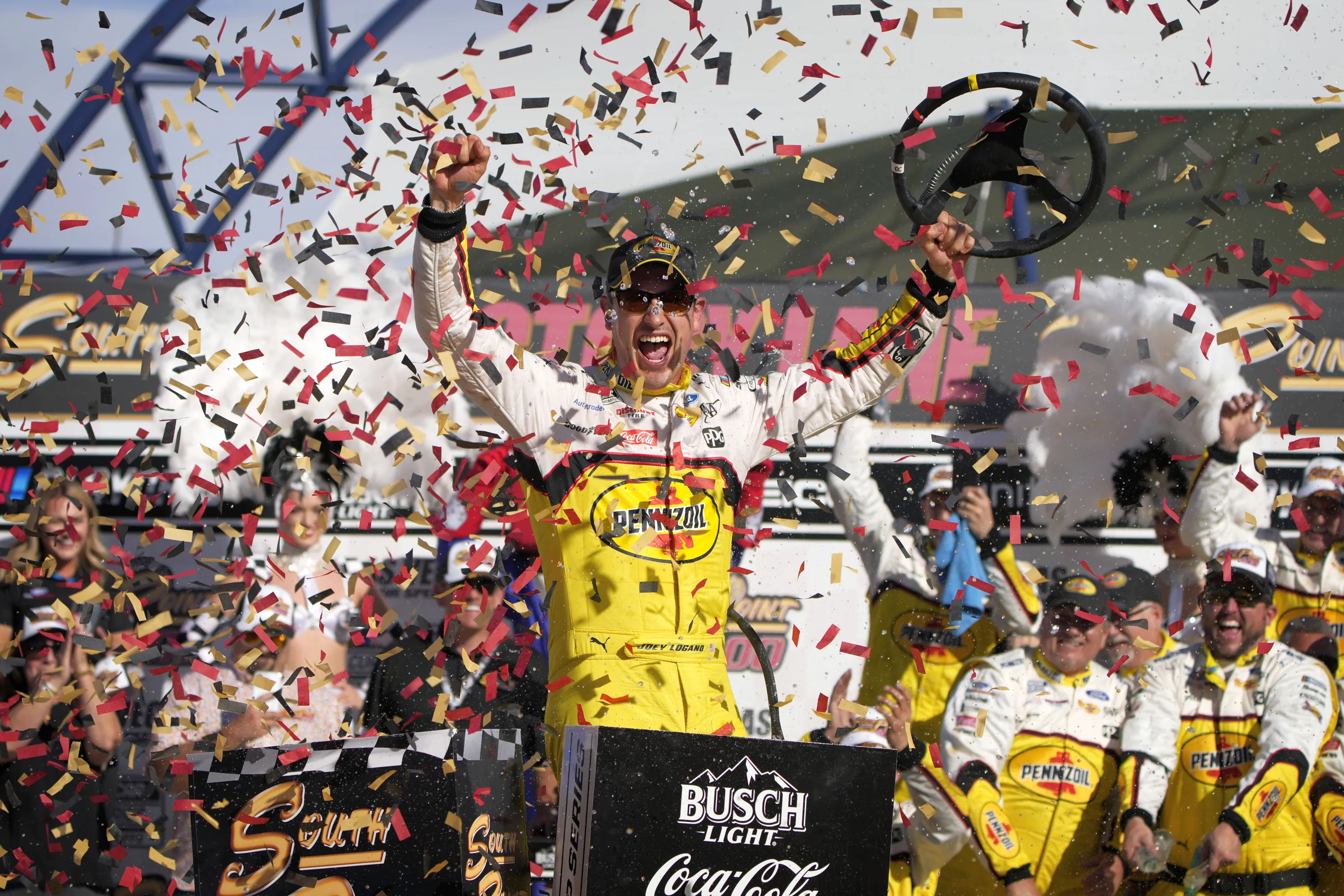 Joey Logano celebrates after winning a NASCAR Cup Series auto race Sunday, October 16, 2022, in Las Vegas. (Photo by John Locher/AP Photo)