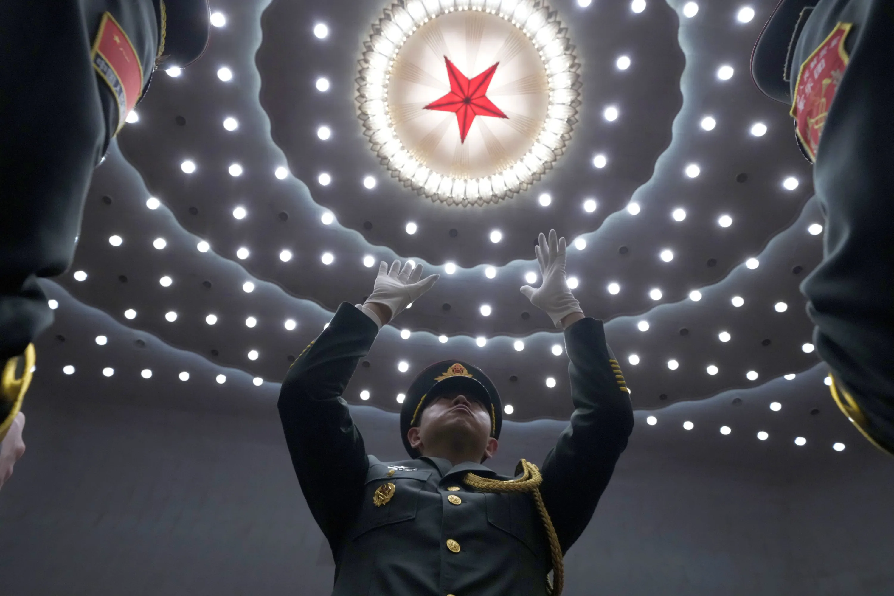 A director conducts band members as they perform during the closing ceremony of the 20th National Congress of China's ruling Communist Party at the Great Hall of the People in Beijing, Saturday, October 22, 2022. (Photo by Ng Han Guan/AP Photo)