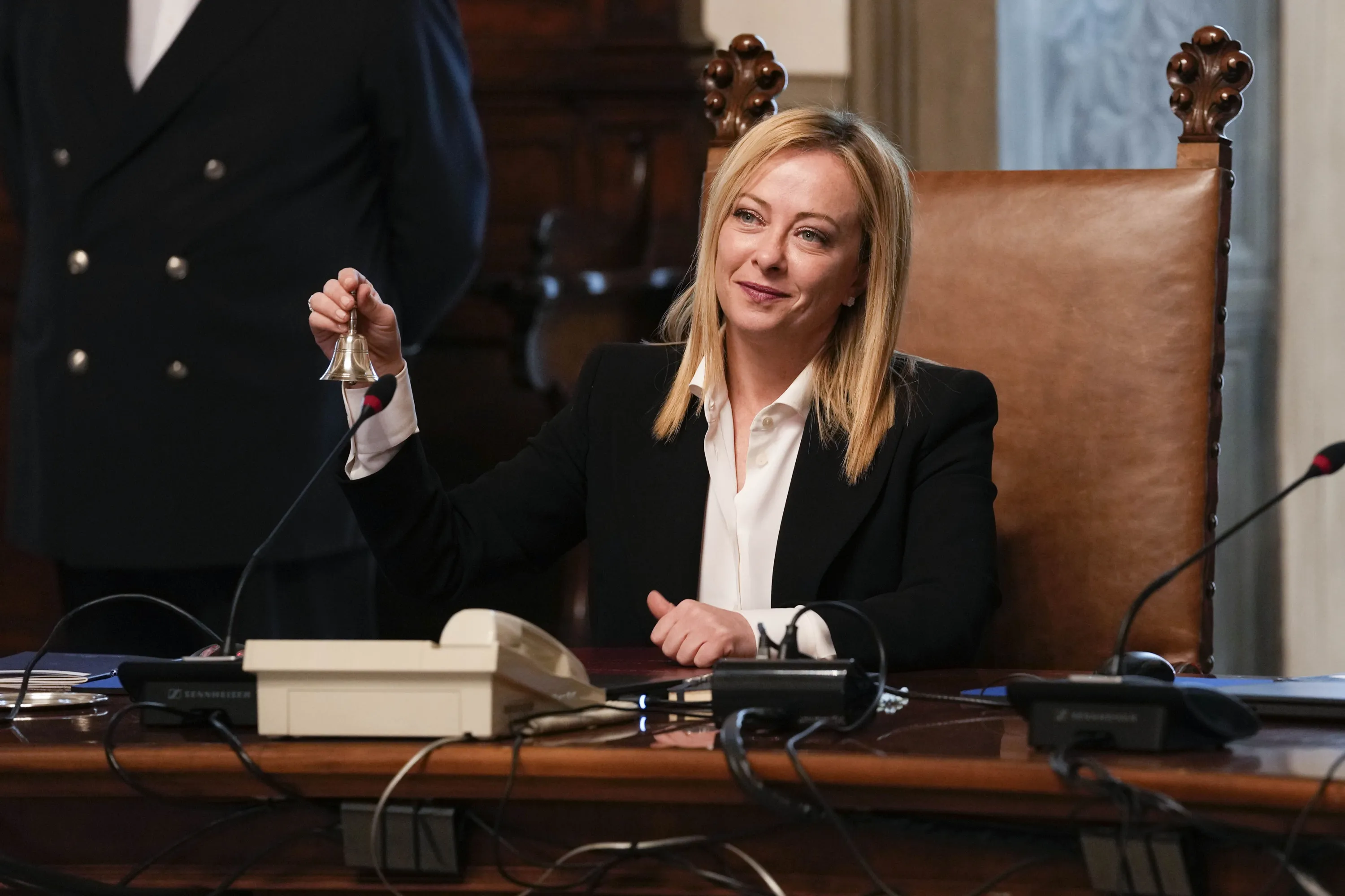 New Italian Premier Giorgia Meloni rings the cabinet minister bell during her first cabinet meeting at Chigi Palace Premier's office, in Rome, Sunday, October 23, 2022. Giorgia Meloni, 45, whose political party with neo-fascist roots secured the most votes in Italy's national election last month, took office Sunday as the country's first far-right premier since the end of World War II. She is also the first woman to serve as premier. (Photo by Andrew Medichini/AP Photo)