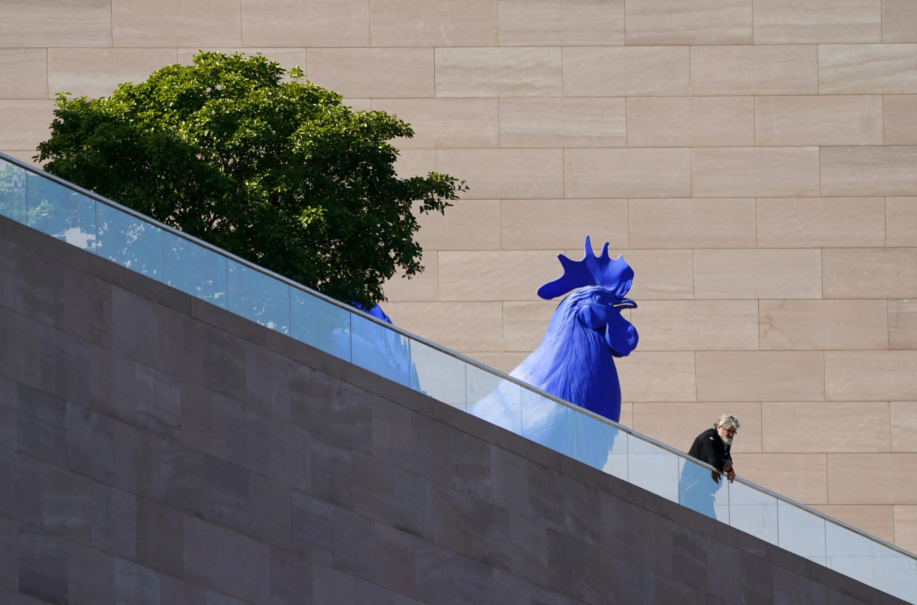 A security guard peers down while standing beside a giant blue rooster sculpture by Katharina Fritsch at the National Gallery of Art in Washington, U.S., October 20, 2022. (Photo by Kevin Lamarque/Reuters)