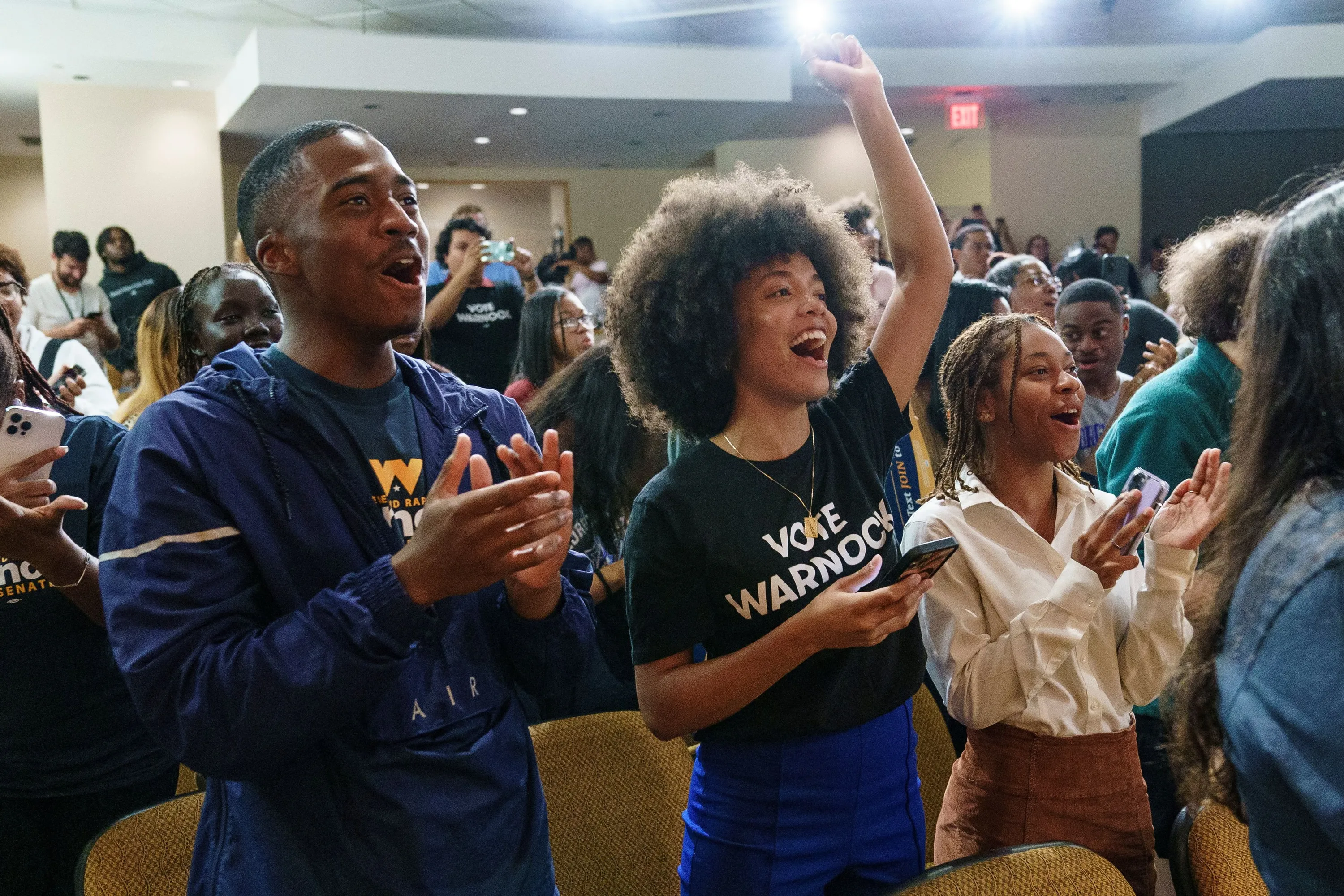 Students cheer as U.S. Senator Raphael Warnock walks on stage to speak at a campaign event at Georgia State University in Atlanta, Georgia, U.S. October 17, 2022. (Photo by Elijah Nouvelage/Reuters)