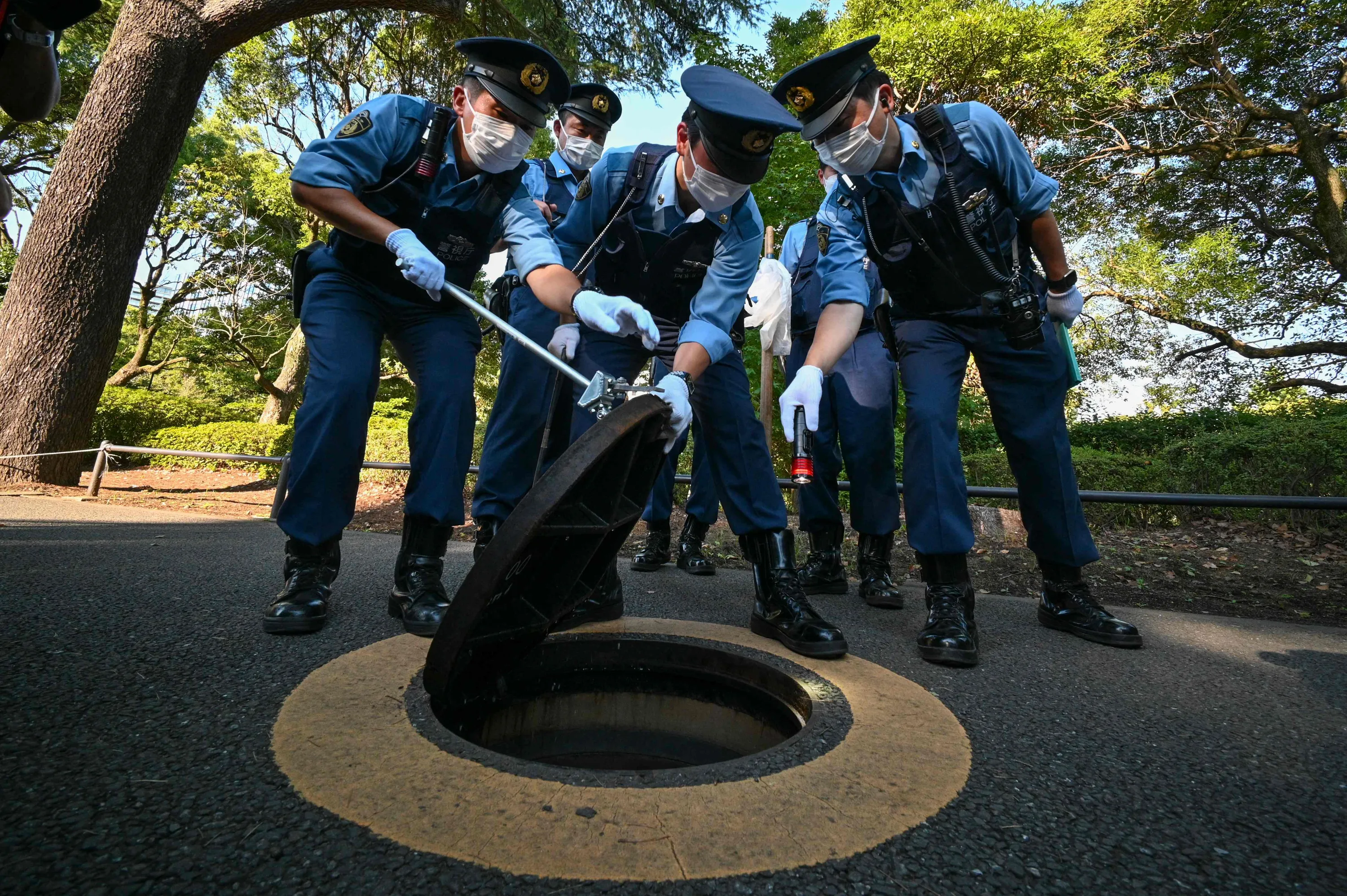 Police officers inspect a manhole near the Budokan Hall, venue for the September 27 state funeral of former Japanese prime minister Shinzo Abe, in Tokyo on September 26, 2022. (Photo by Kazuhiro Nogi/AFP Photo)