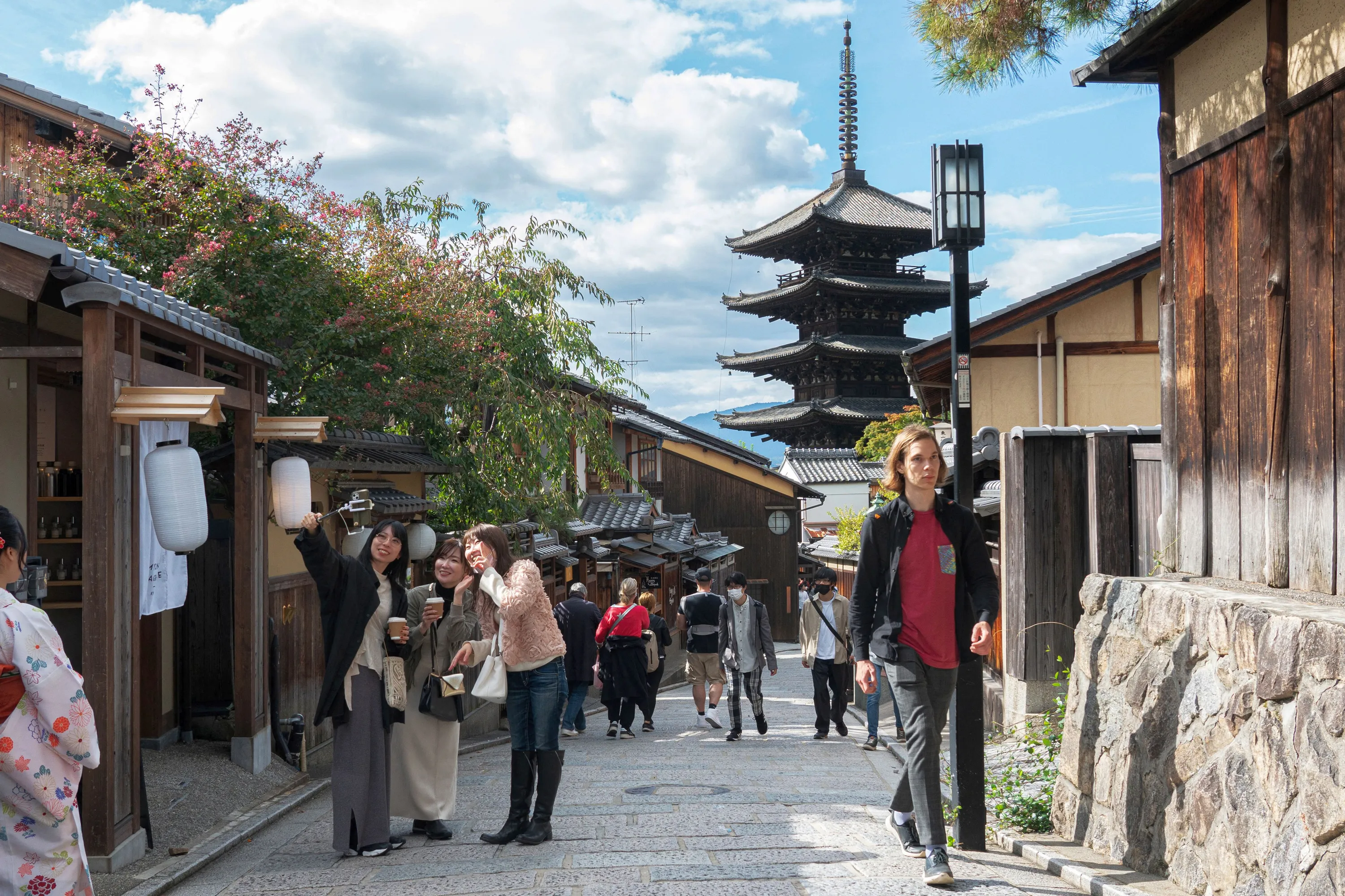 People stroll along the stone-paved pedestrianised Sannen-zaka, a popular tourist area in Kyoto on October 11, 2022. Japan reopened its doors to tourists on October 11 after two-and-a-half years of tough Covid-19 restrictions, with officials hoping an influx of travellers enticed by a weak yen will boost the economy. (Photo by Fred Mery/AFP Photo)