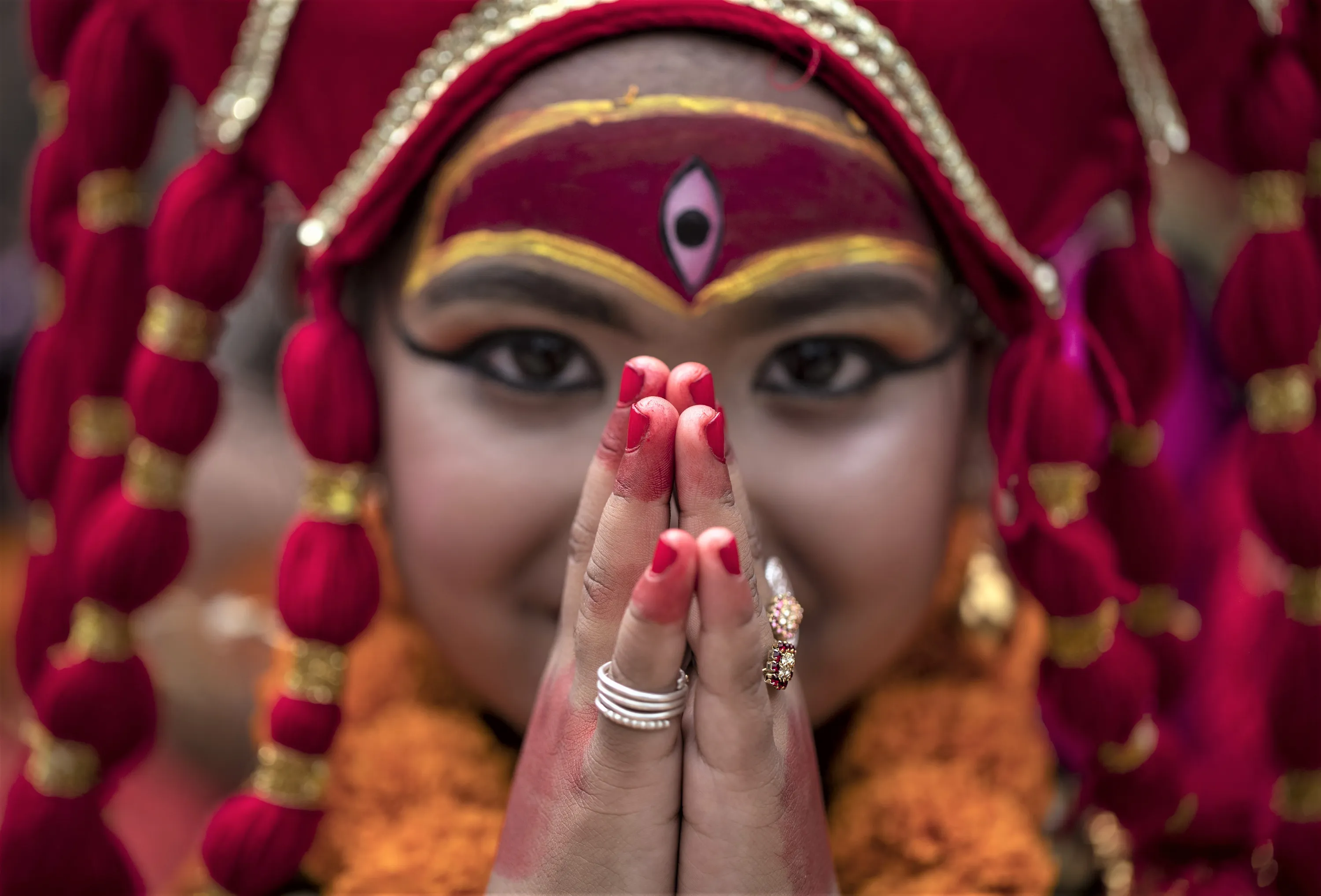A Nepalese girl wearing traditional attire looks on while attending the Kumari Puja, a baby girl mass worship ceremony at Hanuman Dhoka Durbar Square in Kathmandu, Nepal, 08 September 2022. Hundreds of girls under the age of nine from across the country gathered for the mass worship, believing in protection from evil and good luck in the future. (Photo by Narendra Shrestha/EPA/EFE/Rex Features/Shutterstock)