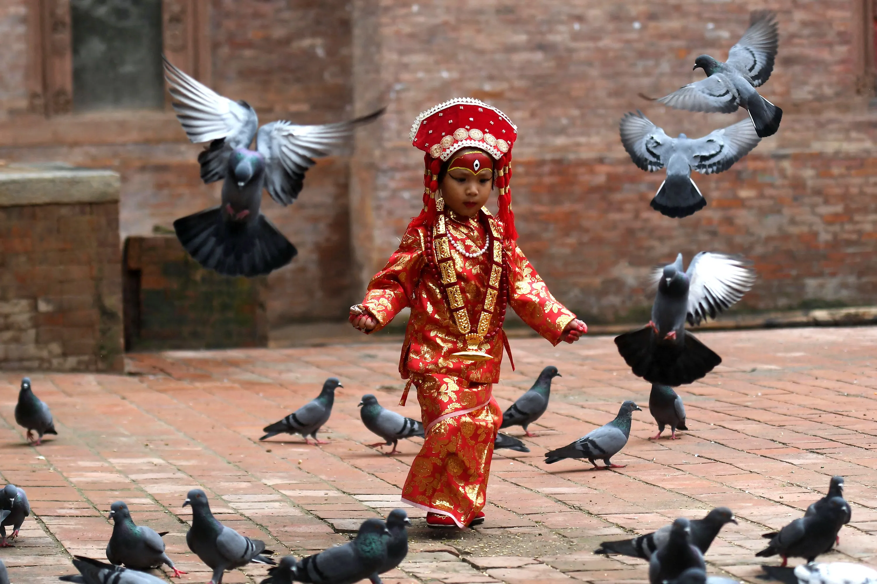 A girl dressed as a Kumari, a living goddess, runs after pigeons before taking part in “Kumari Puja” rituals at the Hanuman Dhoka in Durbar Square in Kathmandu on September 8, 2022. (Photo by Prakash Mathema/AFP Photo)