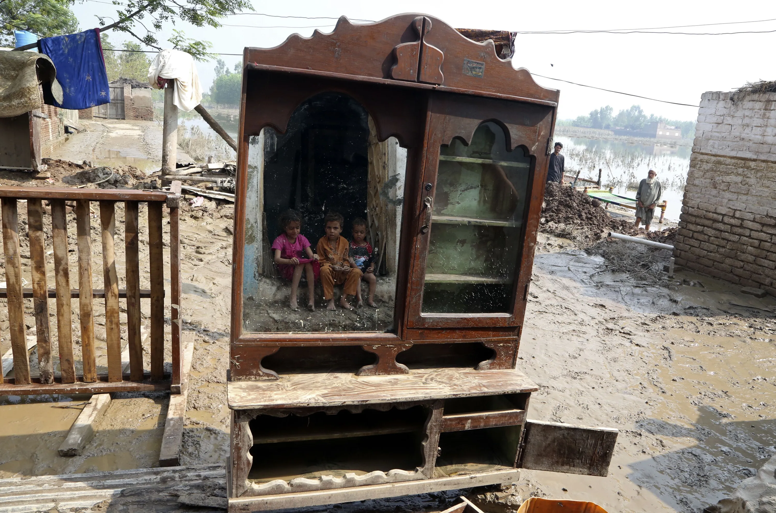 Children are reflected in a mirror near their flood-hit home, in Charsadda, Pakistan, Wednesday, August 31, 2022. Officials in Pakistan raised concerns Wednesday over the spread of waterborne diseases among thousands of flood victims as flood waters from powerful monsoon rains began to recede in many parts of the country. (Photo by Mohammad Sajjad/AP Photo)