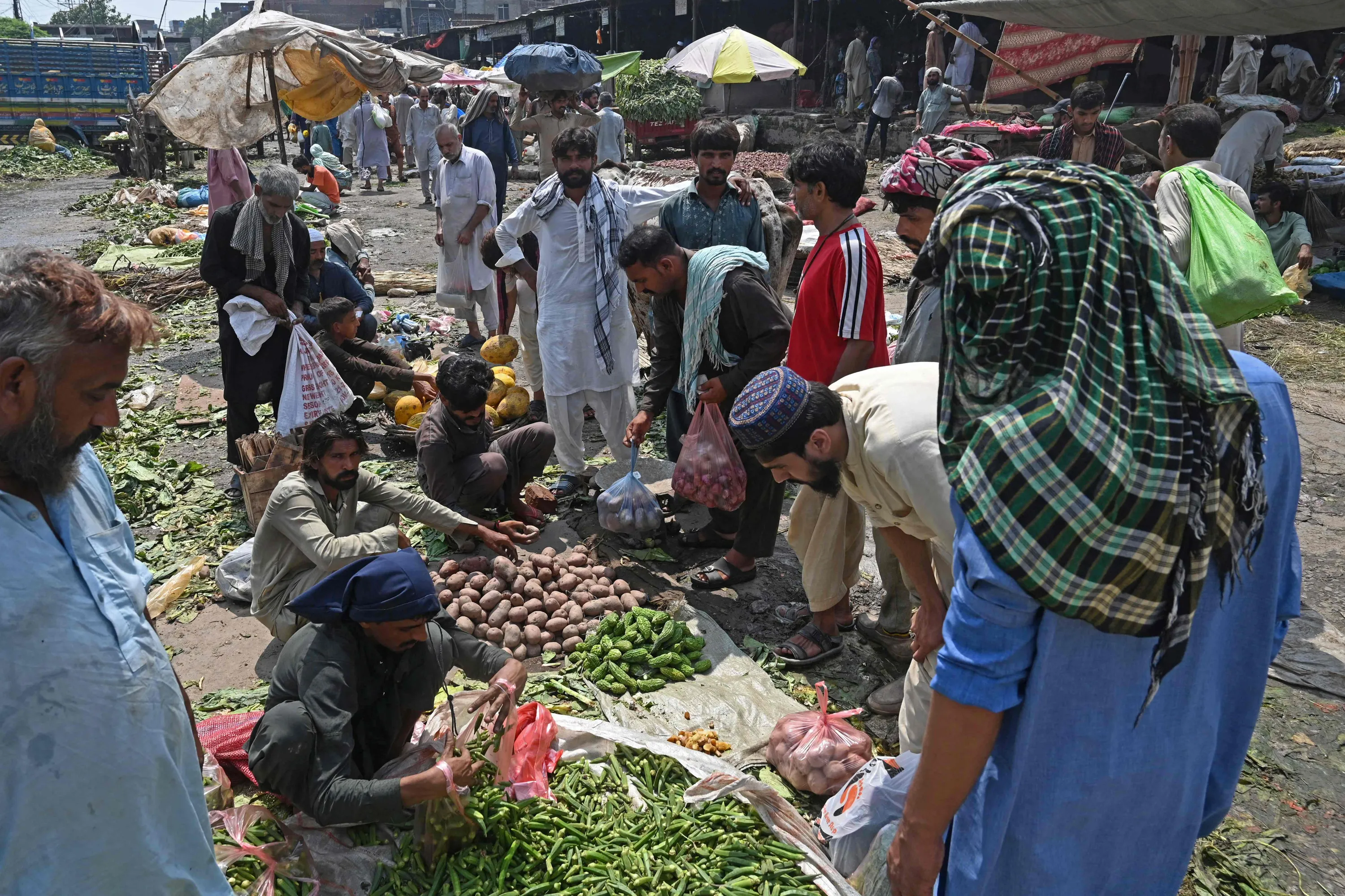 People buy vegetables at a local market in Lahore on August 30, 2022. Catastrophic monsoon floods in Pakistan have sent food prices skyrocketing, putting many staples out of the reach of the poor as the cash-strapped nation battles shortages. The floods have submerged a third of the country, killing more than 1,100 people and affecting over 33 million. (Photo by Arif Ali/AFP Photo)