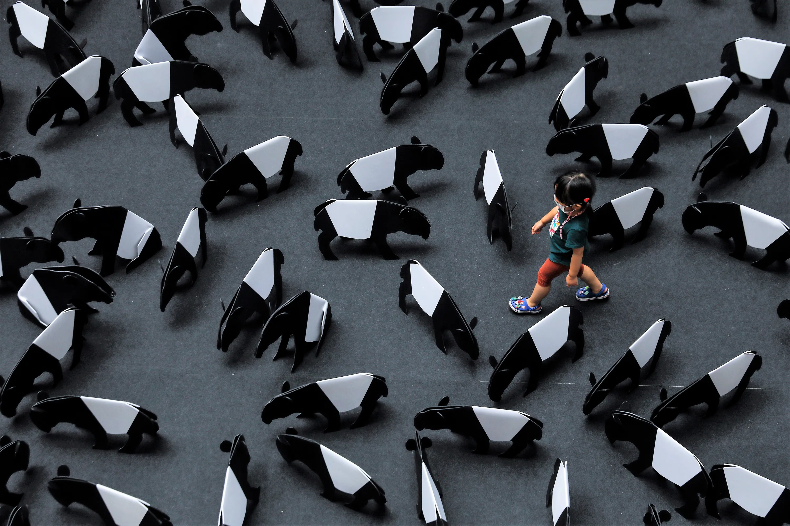 A child walks near the 101 mini Tapir's art installation by Malaysia artist Nicholas Lim at Publika, in Kuala Lumpur, Malaysia, 03 August 2022. The display will be held from 25 July until 07 August 2022 to raise awareness of this endangered species. (Photo by Fazry Ismail/EPA/EFE)