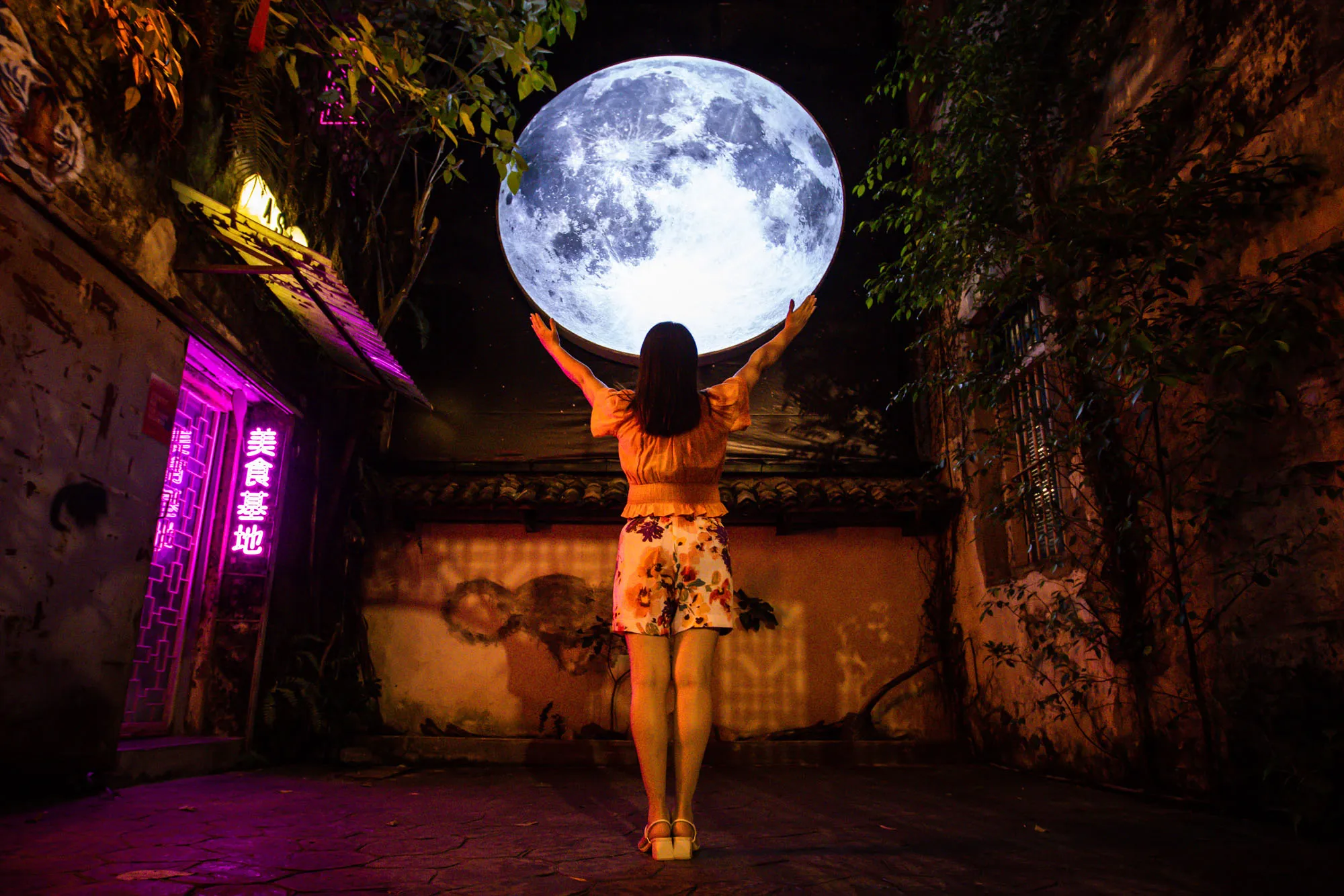 A visitor poses for a photo in front of a giant full moon installation at Kwai Chai Hong, a heritage revival back alley in Chinatown on September 03, 2022 in Kuala Lumpur, Malaysia. The Mid-Autumn Festival is held on the fifteenth day of the eighth month (September 10 this year) in the Chinese lunar calendar, on a full moon day. The festival is a joyous celebration with family reunions, eating mooncakes, street decorations and children holding lanterns as they march around the neighbourhood at night. (Photo by Annice Lyn/Getty Images)