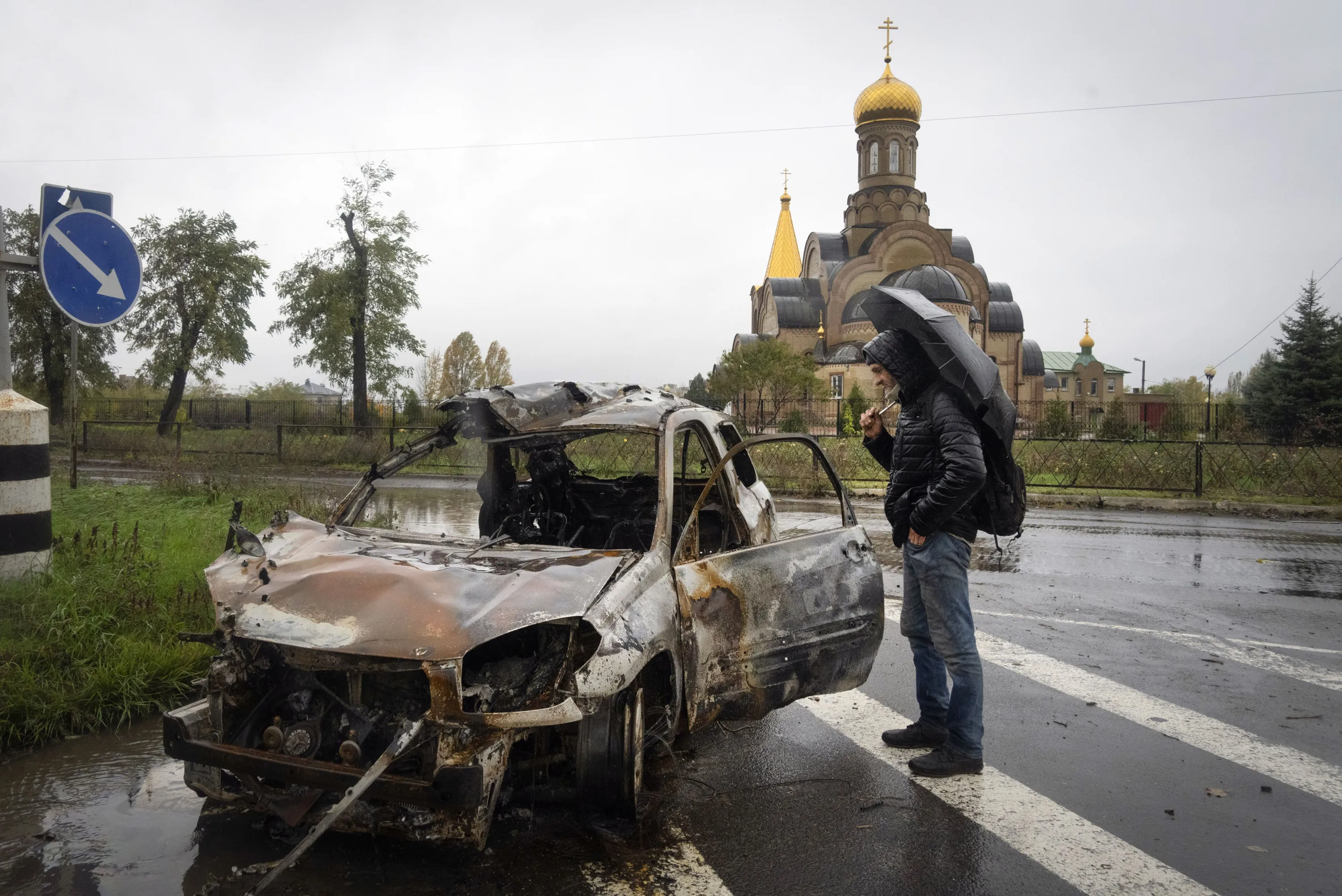 A passerby looks at a car damaged by Russian shelling in central Bakhmut, the site of the heaviest battle against the Russian troops in the Donetsk region, Ukraine, Wednesday, October 26, 2022. (Photo by Efrem Lukatsky/AP Photo)