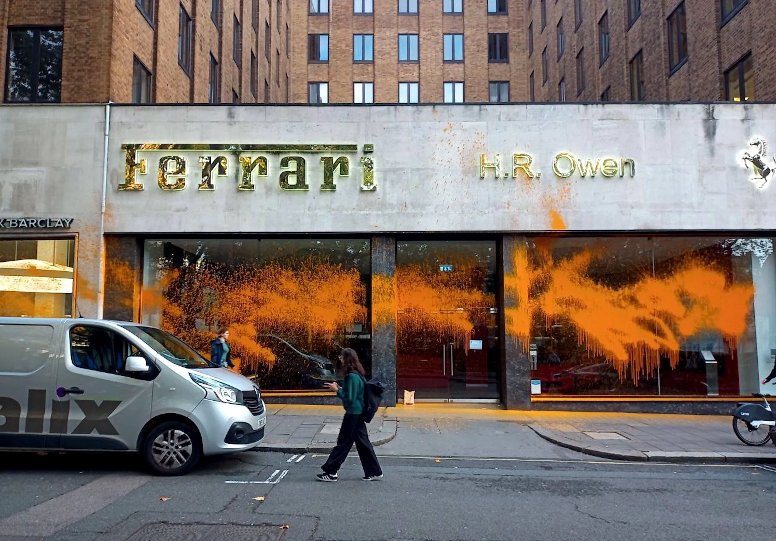 Just Stop Oil protesters have sprayed paint on a number of high end car dealerships in Berkeley Square, London on October 26, 2022. They are demanding that the government halts all new oil and gas licences and consents. (Photo by Just Stop Oil/The Mega Agency)
