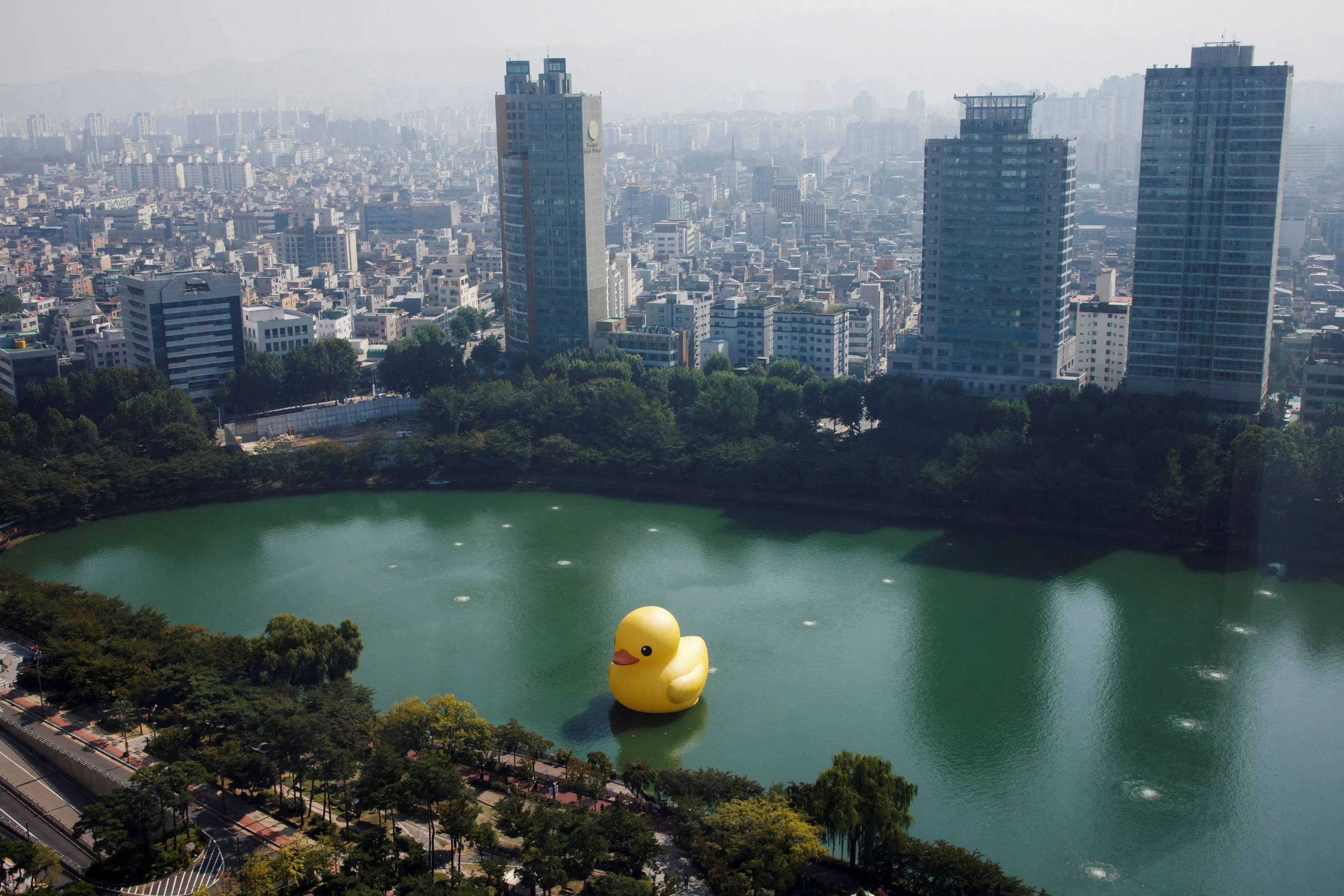 A giant inflatable Rubber Duck installation by Dutch artist Florentijn Hoffman floats on Seokchon Lake in Seoul, South Korea on September 30, 2022. (Photo by Heo Ran/Reuters)
