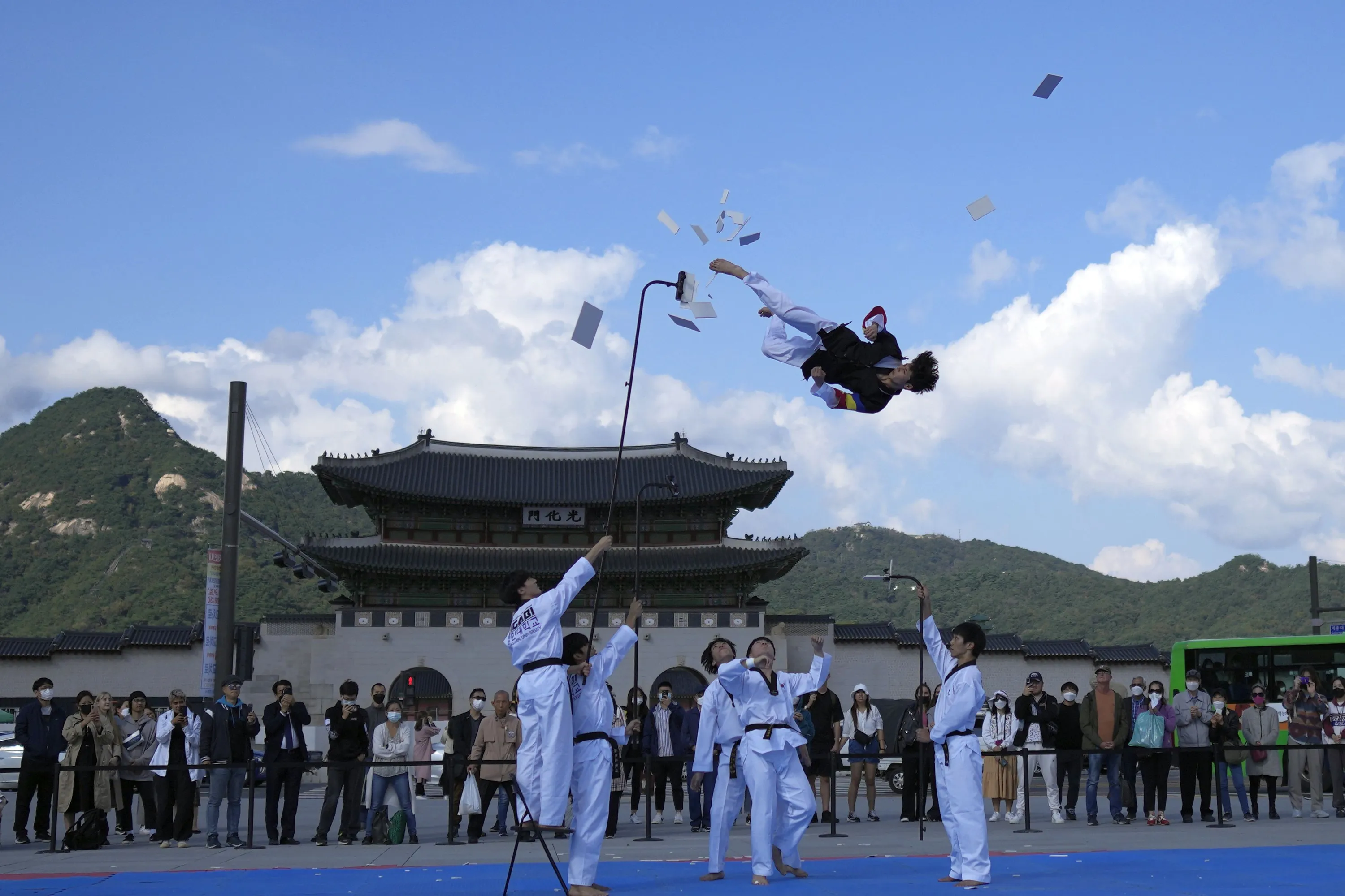 Members of Taekwondo demonstration team break plates during the Taekwondo demonstration near the Gwanghwamun, one of South Korea's well-known landmarks, at a square in downtown Seoul, South Korea, Friday, October 7, 2022. (Photo by Lee Jin-man/AP Photo)