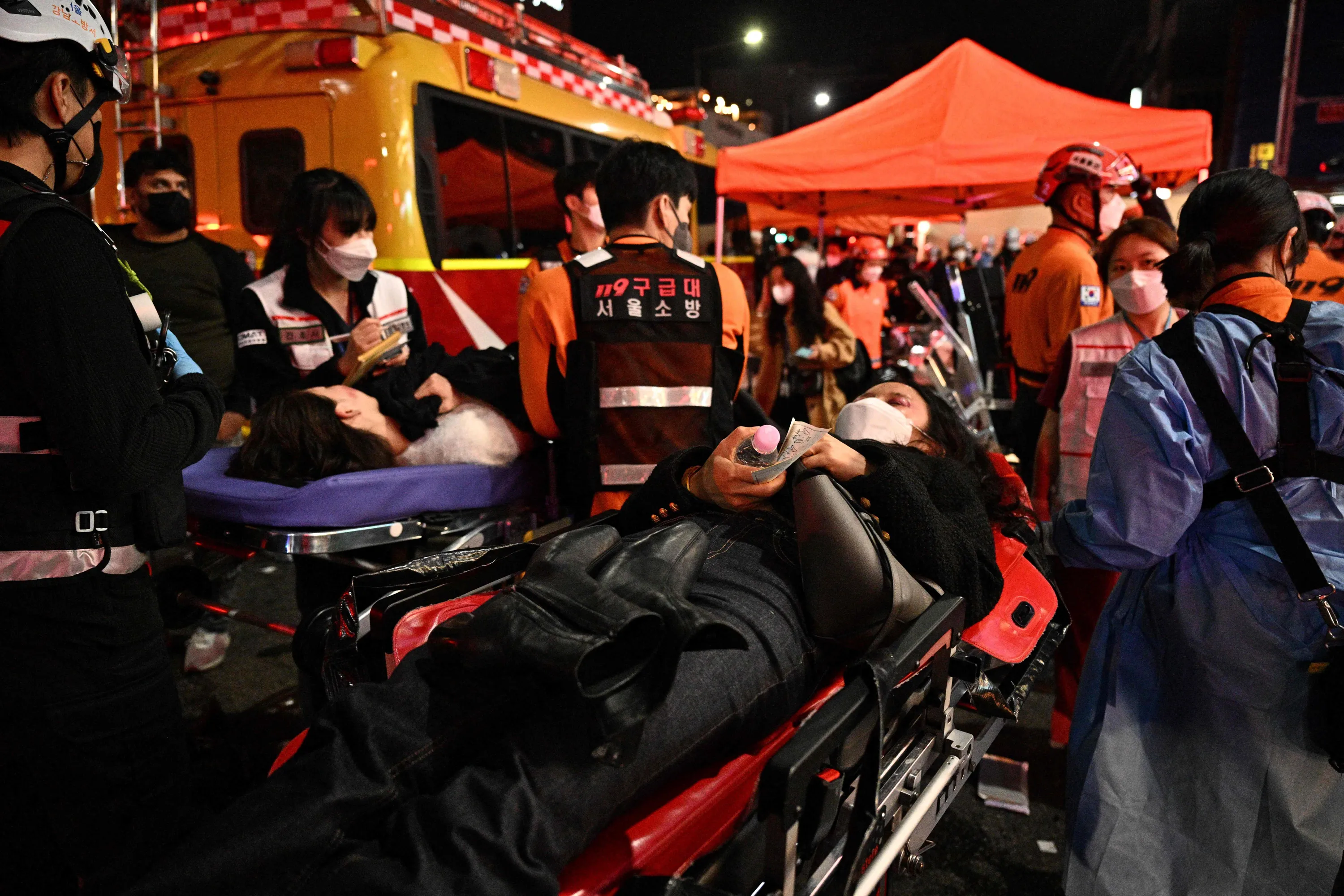 People lie on stretchers to receive medical attention in the popular nightlife district of Itaewon in Seoul on October 30, 2022. Dozens of people suffered from cardiac arrest in the South Korean capital Seoul, after thousands of people crowded into narrow streets in the city's Itaewon neighbourhood to celebrate Halloween, local officials said. (Photo by Anthony Wallace/AFP Photo)