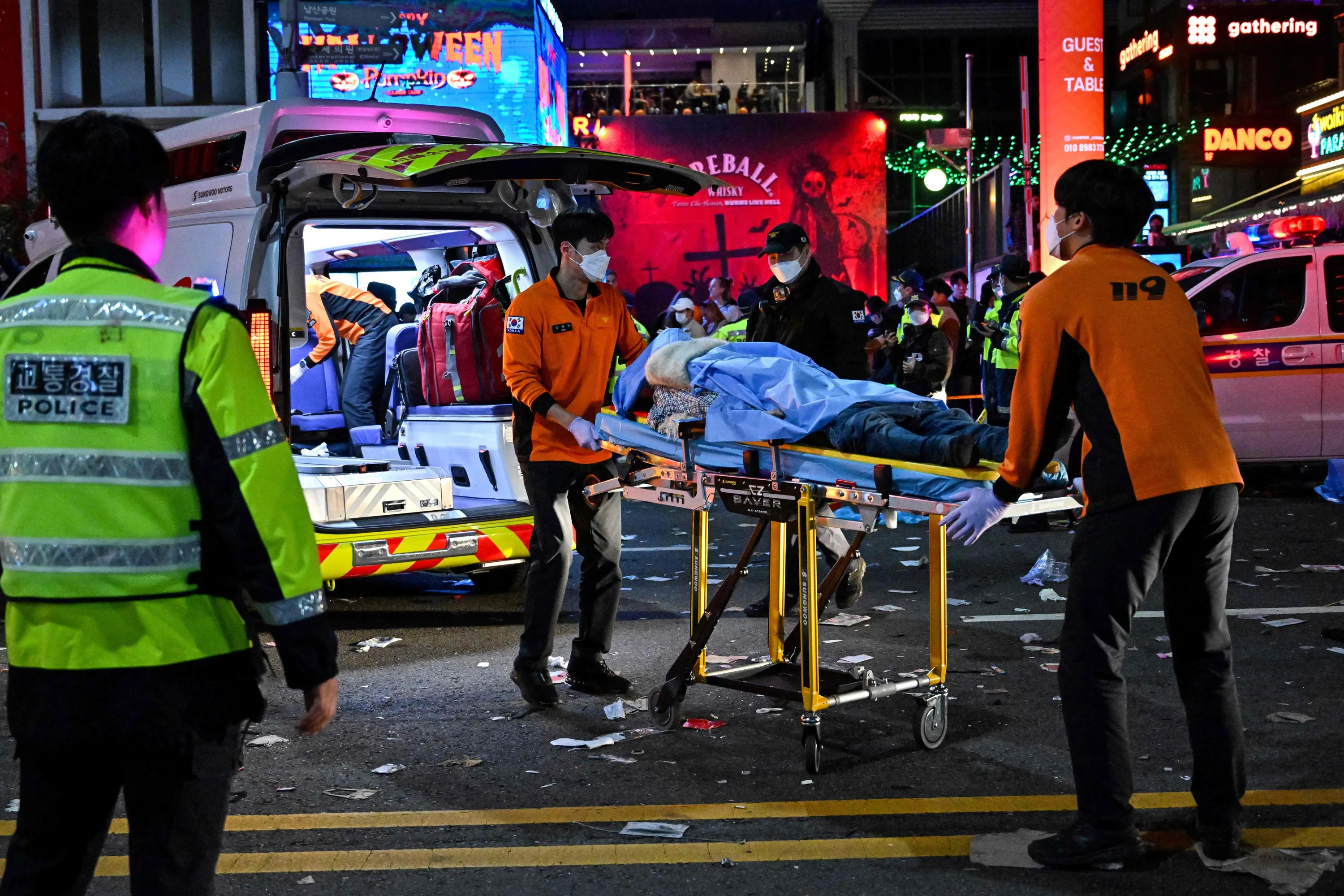 Medical staff transport a victim, believed to have suffered cardiac arrest, in the popular nightlife district of Itaewon in Seoul on October 30, 2022. (Photo by Jung Yeon-je/AFP Photo)