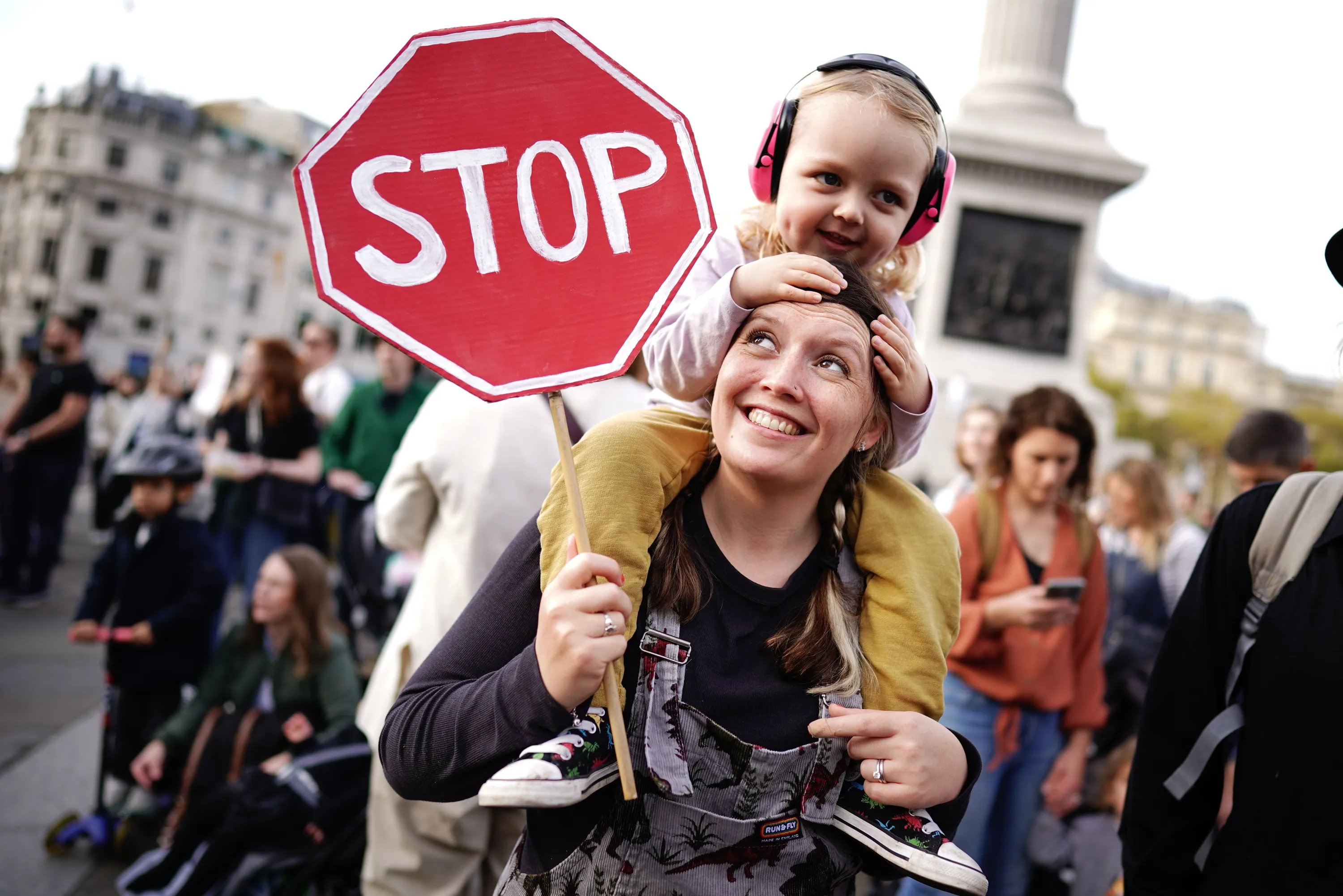Demonstrators take part in the March of the Mummies national protest in central London on Saturday, October 29, 2022. The protest is organised by Pregnant Then Screwed to demand Government reform on childcare, parental leave and flexible working. (Photo by Aaron Chown/PA Images via Getty Images)