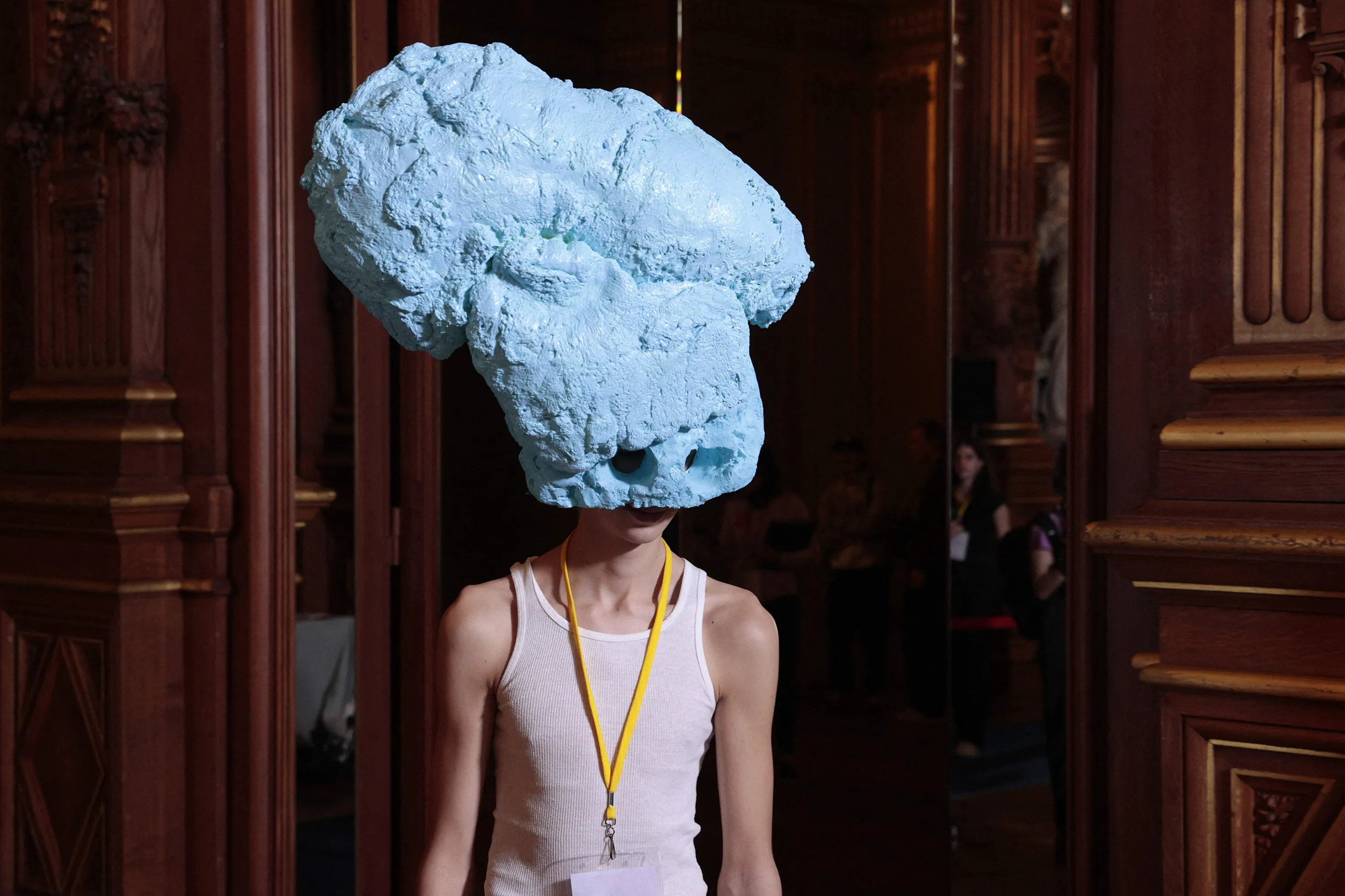 A model waits backstage before a fashion show by the Lisaa fashion designers students in collaboration with the Petits Freres des Pauvres (The Litte Brothers of the Poor) to fight ageism and break down the injunctions surrounding old age in Paris on October 27, 2022. The “Another Look at Old Age” fashion show follows the release of the Association's report and campaign on the affective, intimate and sеxual life of the elderly, which reveals that for 71% of elderly people, an aging body may still be desirable. (Photo by Geoffroy Van der Hasselt/AFP Photo)