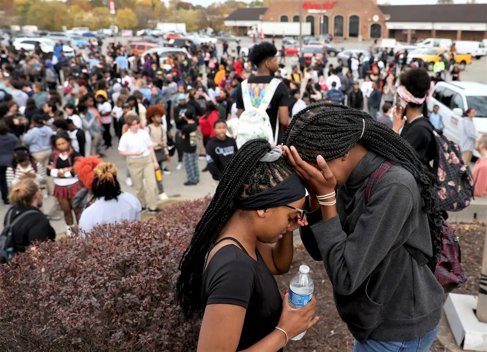 Students stand in a parking lot near the Central Visual & Performing Arts High School after a reported shooting at the school in St. Louis on Monday, October 24, 2022. (Photo by David Carson/St. Louis Post-Dispatch via AP Photo)