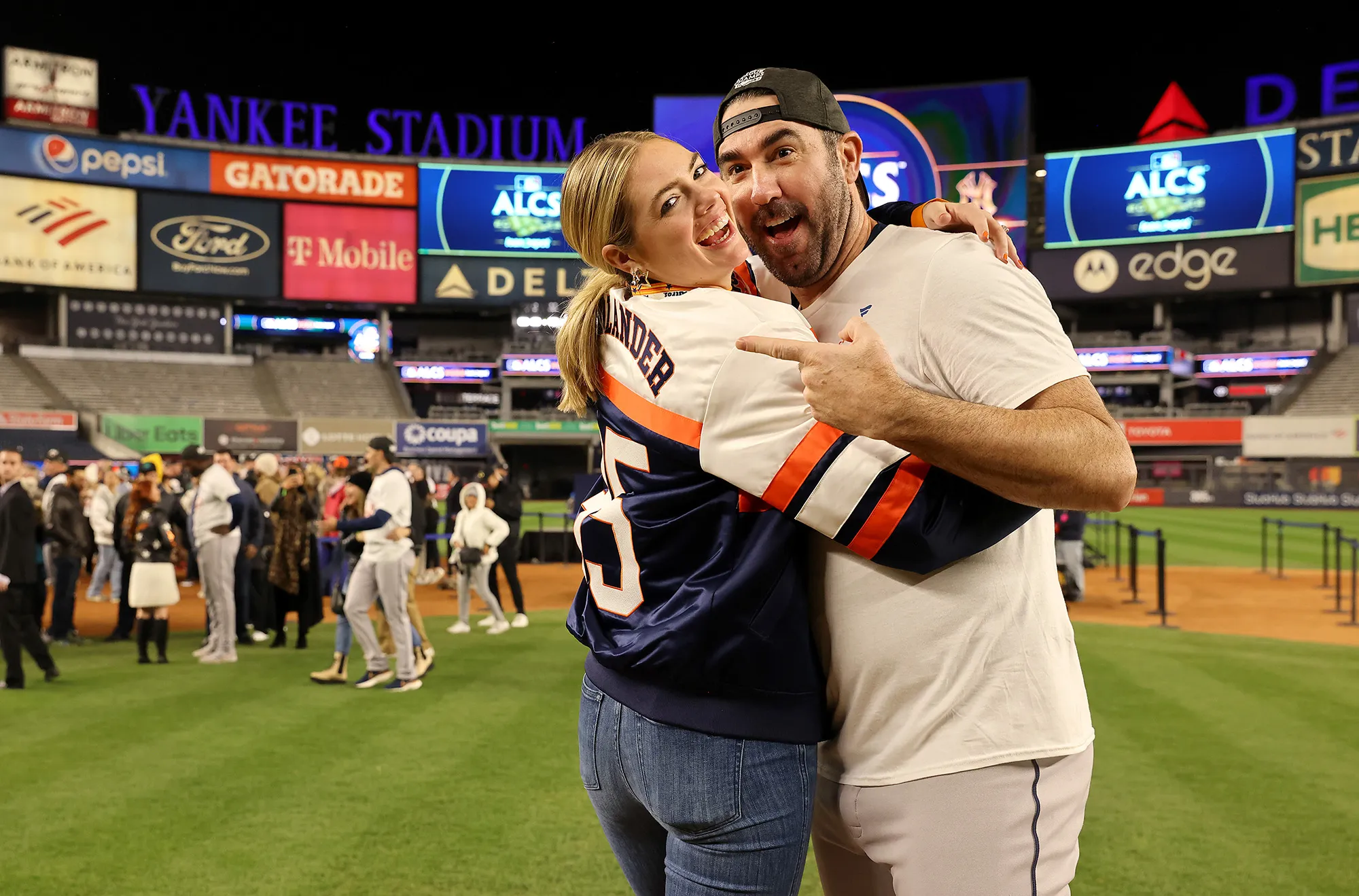 Justin Verlander #35 of the Houston Astros celebrates with his wife Kate Upton following defeating the New York Yankees in game four of the American League Championship Series to advance to the world series at Yankee Stadium on October 23, 2022 in the Bronx borough of New York City. (Photo by Charles Wenzelberg/New York Post)