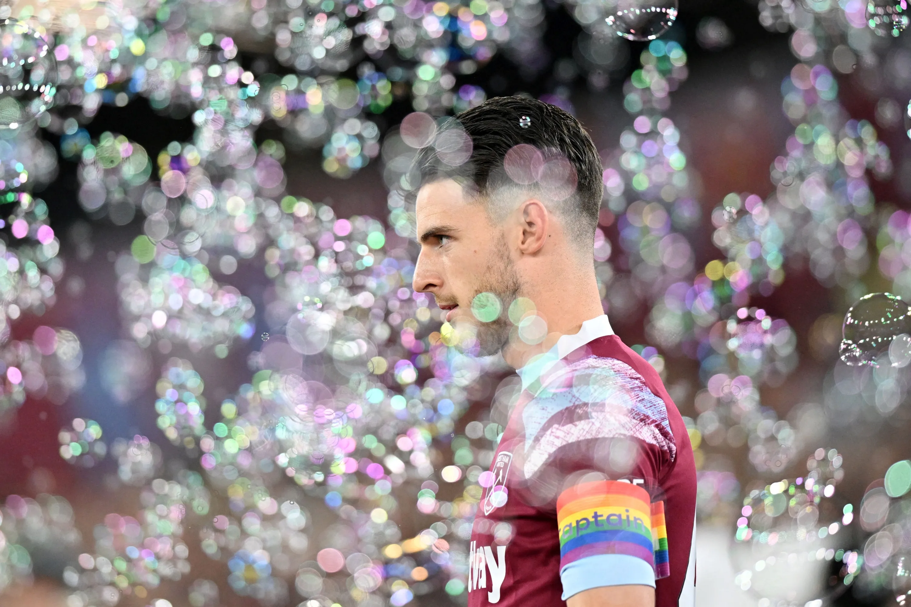 West Ham United's English midfielder Declan Rice reacts prior to the English Premier League football match between West Ham United and Bournemouth at the London Stadium, in east London on October 24, 2022. (Photo by Glyn Kirk/AFP Photo)
