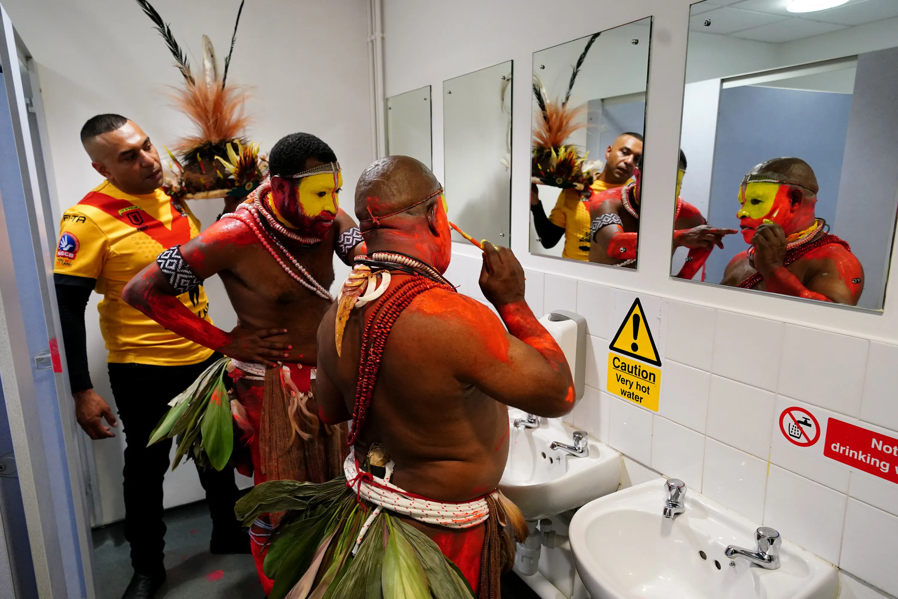 Papau New Guinea fans apply face paint in the toilets ahead of the Rugby League World Cup group D match at The Halliwell Jones Stadium, Warrington, UK on Tuesday, October 25, 2022. (Photo by Mike Egerton/PA Images via Getty Images)