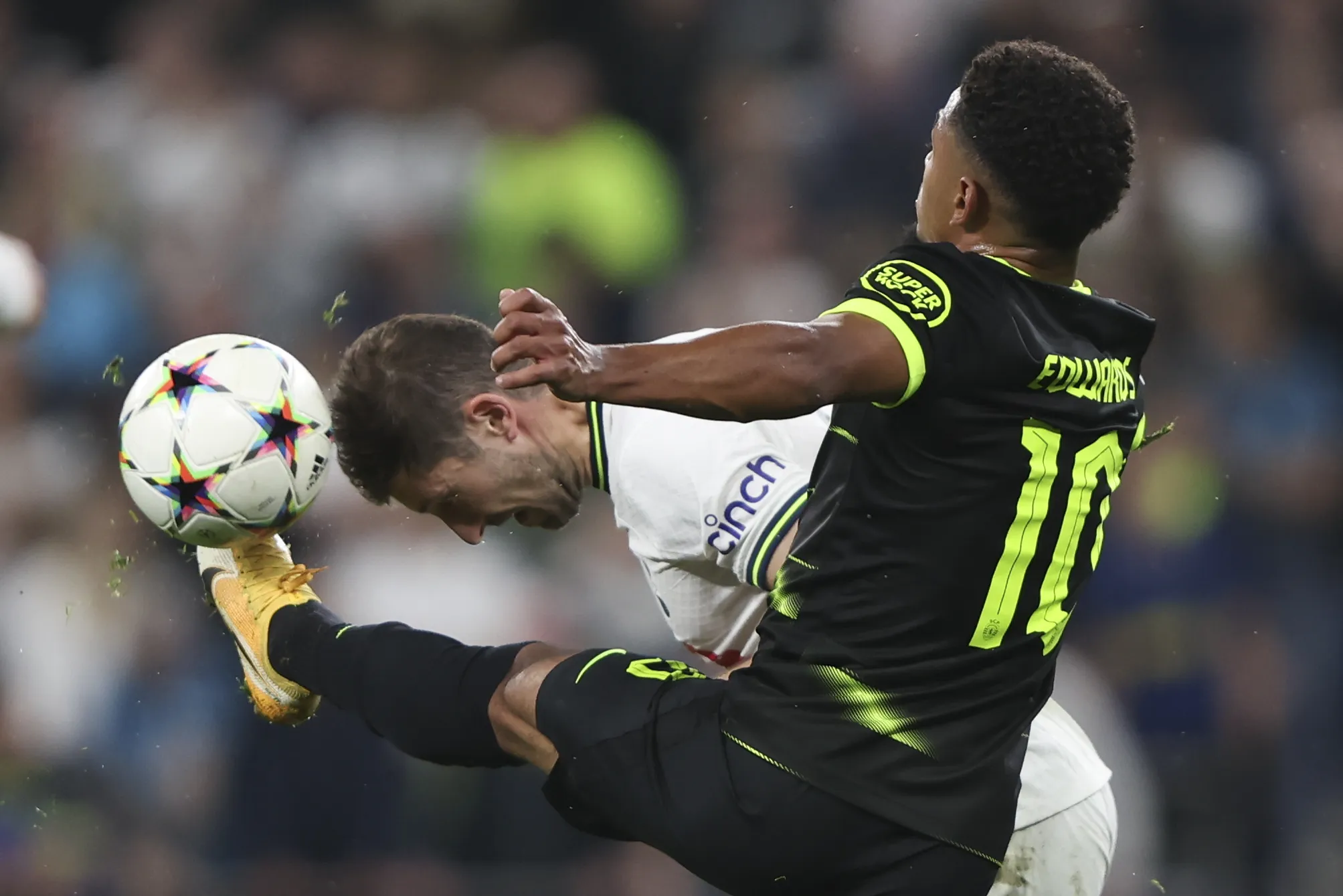 Tottenham's Ben Davies attempts to head the ball away from Sporting's Marcus Edwards during the Champions League group D soccer match between Tottenham Hotspur and Sporting CP at Tottenham Hotspur Stadium in London, Wednesday, October 26, 2022. (Photo by Ian Walton/AP Photo)