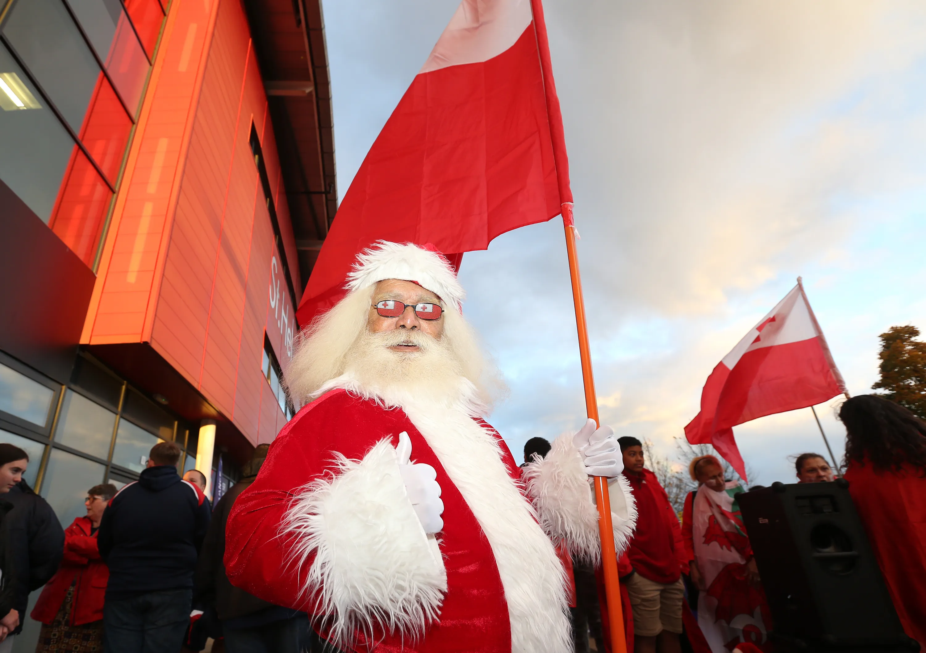 A Tonga Fan dressed as Santa Claus looks on ahead of the Rugby League World Cup 2021 Pool D match between Tonga and Wales at Totally Wicked Stadium on October 24, 2022 in St Helens, England. (Photo by Jan Kruger/Getty Images for RLWC)