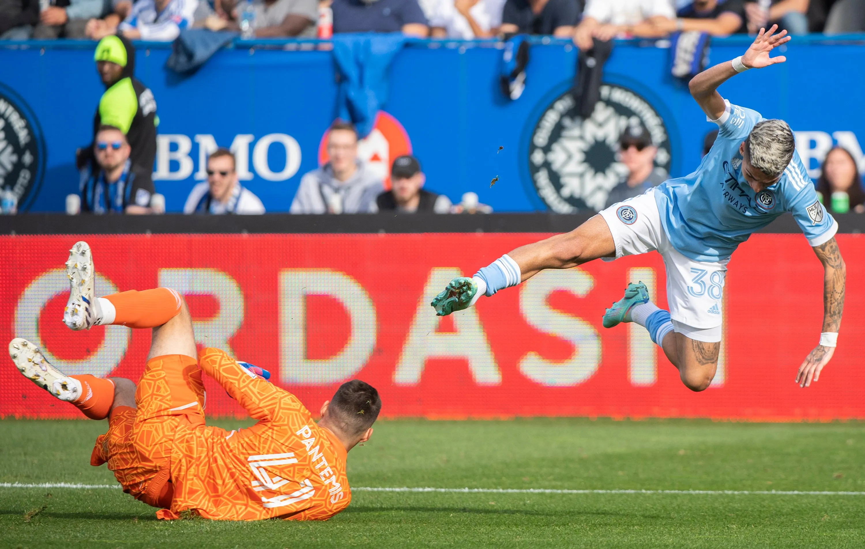 NYFC midfielder Gabriel Pereira (38) is brought down in the box by CF Montreal goalkeeper James Pantemis during the second half of an Eastern Conference semifinals soccer game in Montreal, Sunday, October 23, 2022. (Photo by Graham Hughes/The Canadian Press via AP Photo)