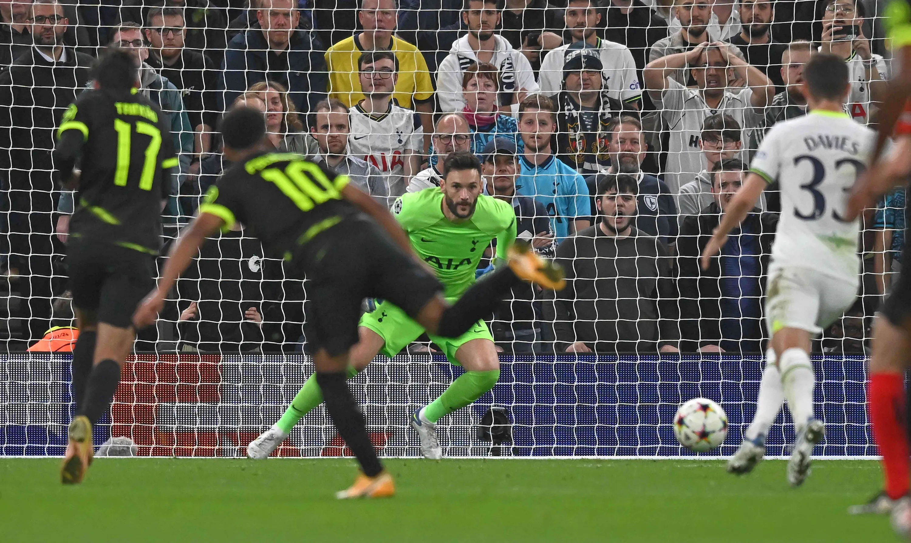 Tottenham Hotspur's French goalkeeper Hugo Lloris (C) watches the ball before conceding the opening goal to Sporting Lisbon's English striker Marcus Edwards (2L) during the UEFA Champions League group D football match between Tottenham Hotspur and Sporting Lisbon at the Tottenham Hotspur Stadium in London, on October 26, 2022. (Photo by Ben Stansall/AFP Photo)