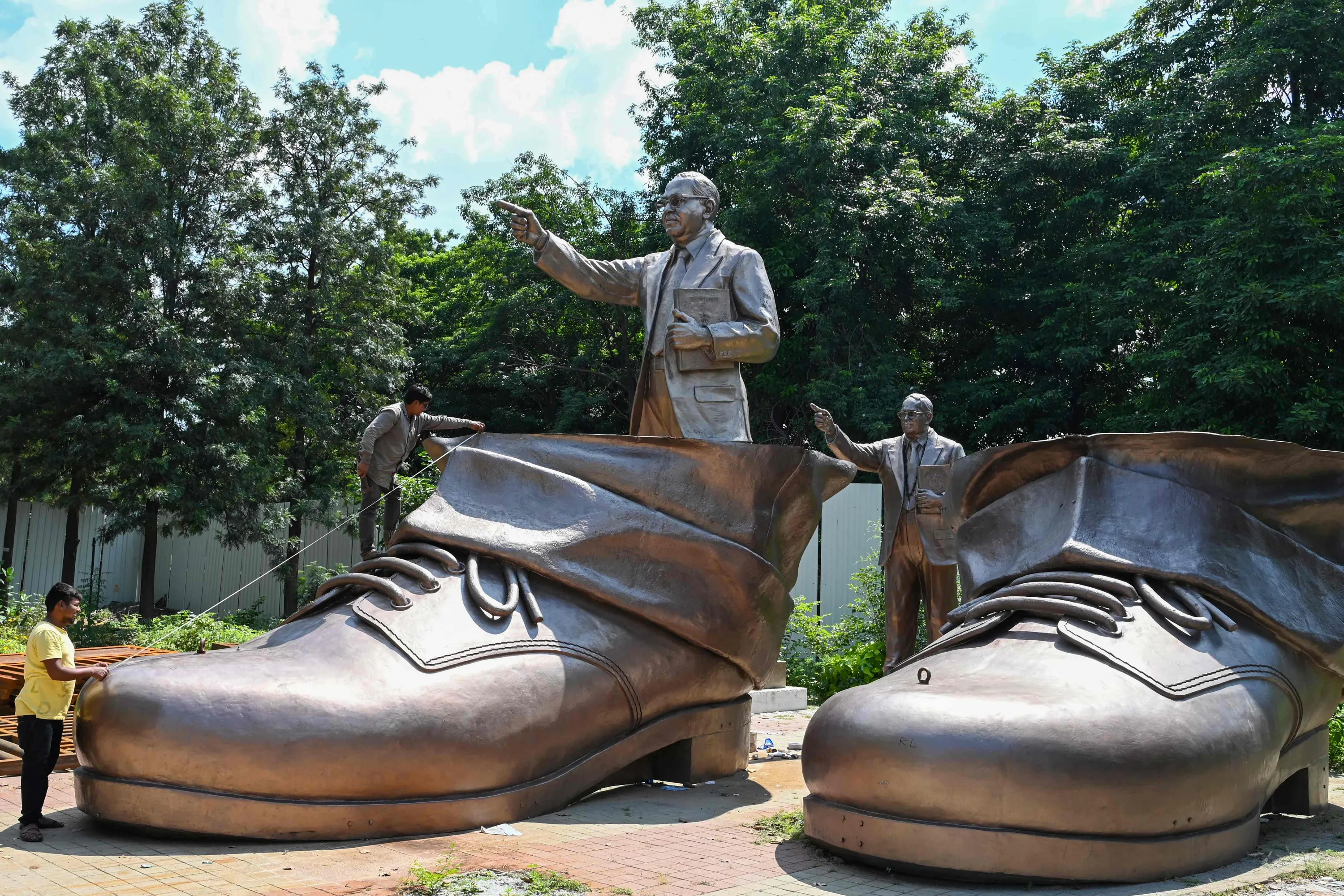 Labourers work on the shoes of a 125-feet tall statue of social reformer Dr. B.R. Ambedkar in Hyderabad on October 18, 2022. (Photo by Noah Seelam/AFP Photo)