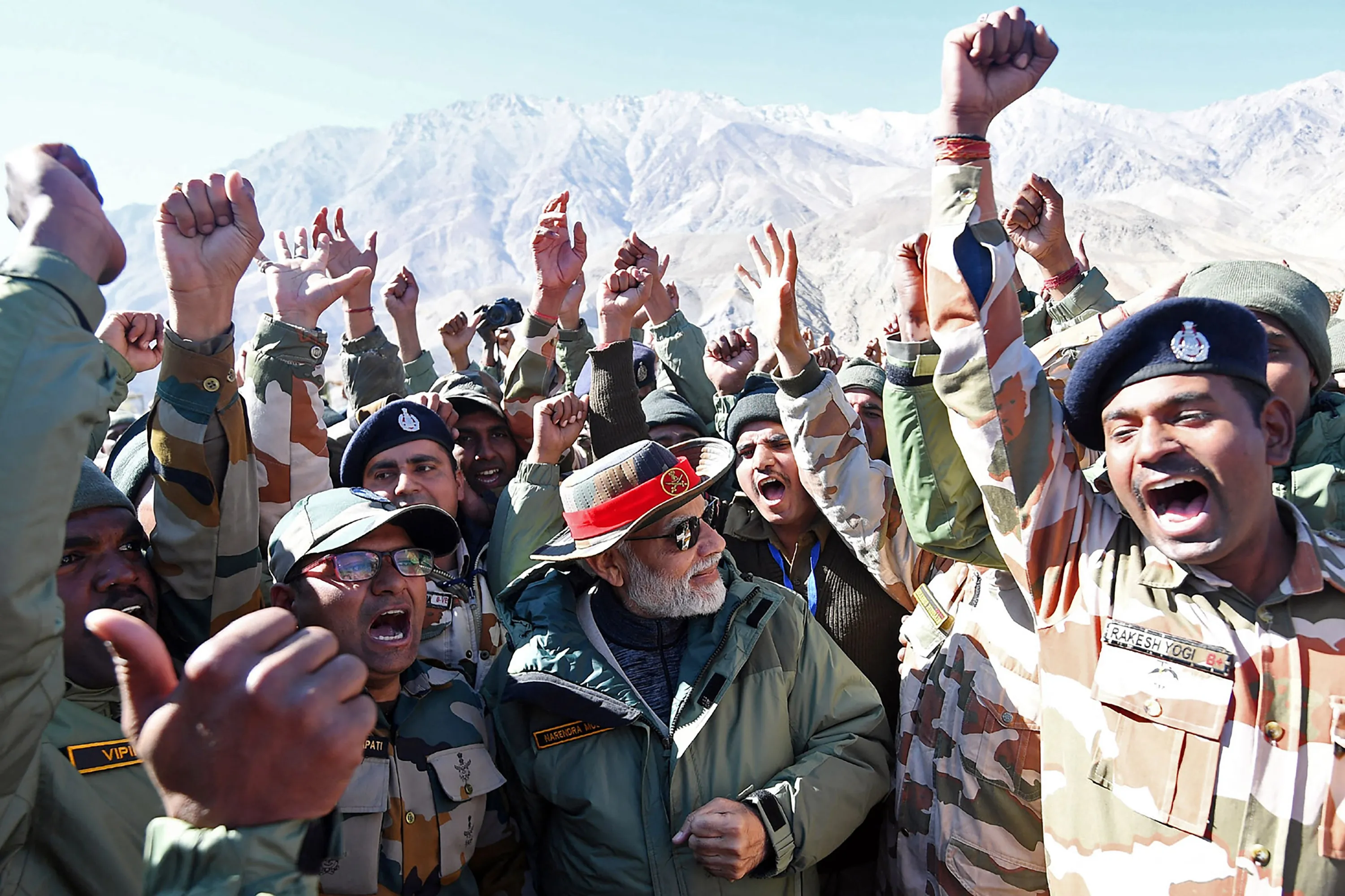 This handout photograph taken on October 24, 2022 and released by the Indian Press Information Bureau (PIB) shows India's Prime Minister Narendra Modi (C) attending the celebrations with the members of Indian armed forces on the occasion of Diwali, the Hindu festival of lights, at Kargil. (Photo by PIB/AFP Photo)