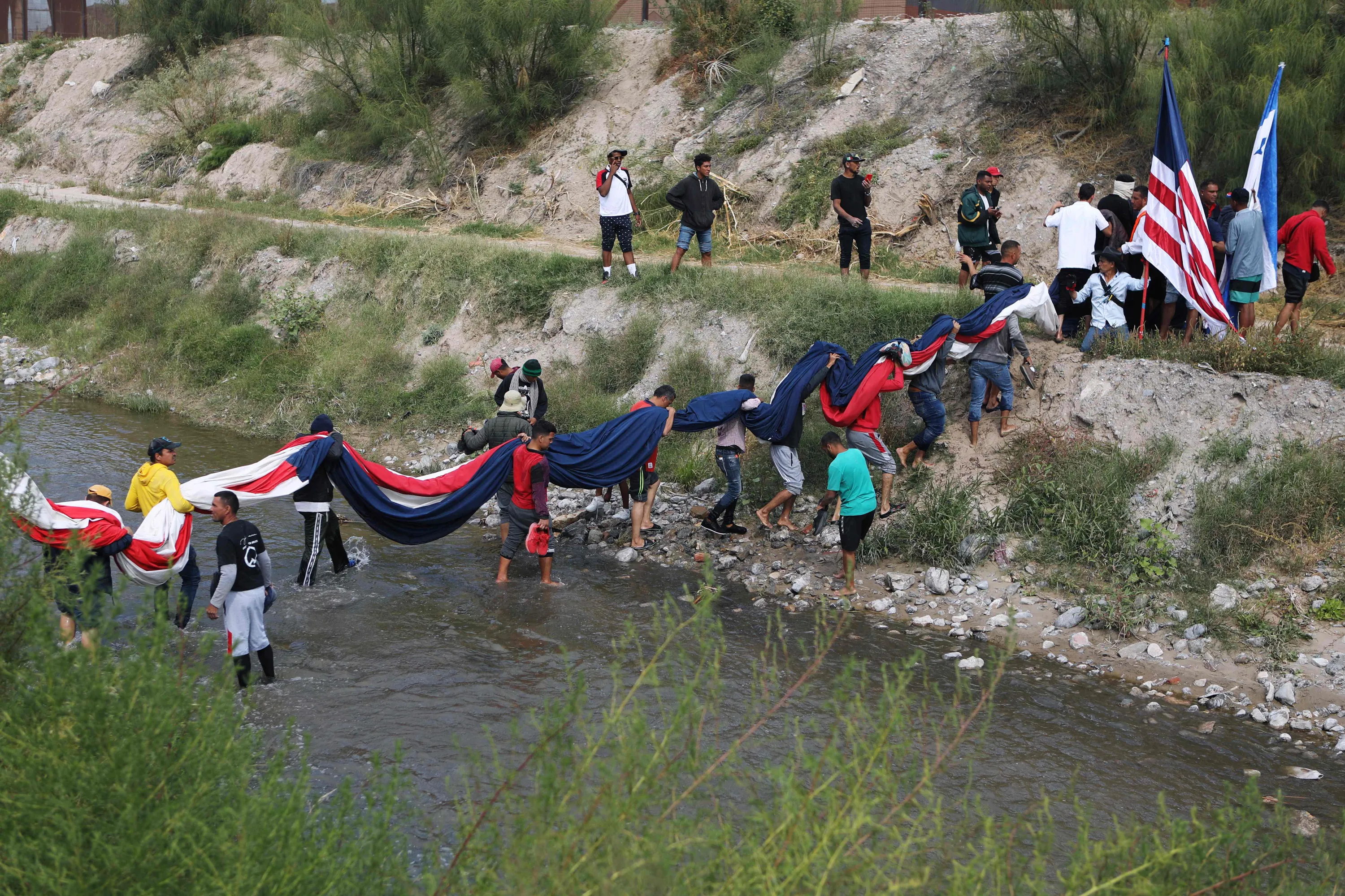Venezuelan migrants cross the Rio Bravo river (or Rio Grande river, as it is called in the US) to hold a demonstration against the US immigration policies in Ciudad Juarez, Mexico, on October 31, 2022. (Photo by Herika Martinez/AFP Photo)
