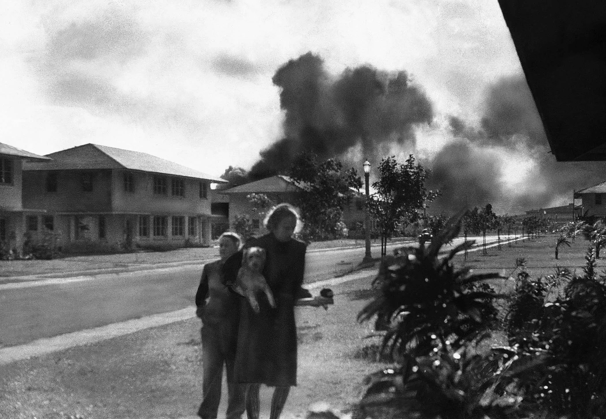 Officers' wives, investigating explosions and seeing smoke in the distance, heard neighbor Mary Naiden, then an Army hostess who took this picture, exclaim "There are red circles on those planes overhead. They are Japanese!" Realizing war had come, the two women, stunned, started toward quarters. (Mary Naiden/Associated Press)