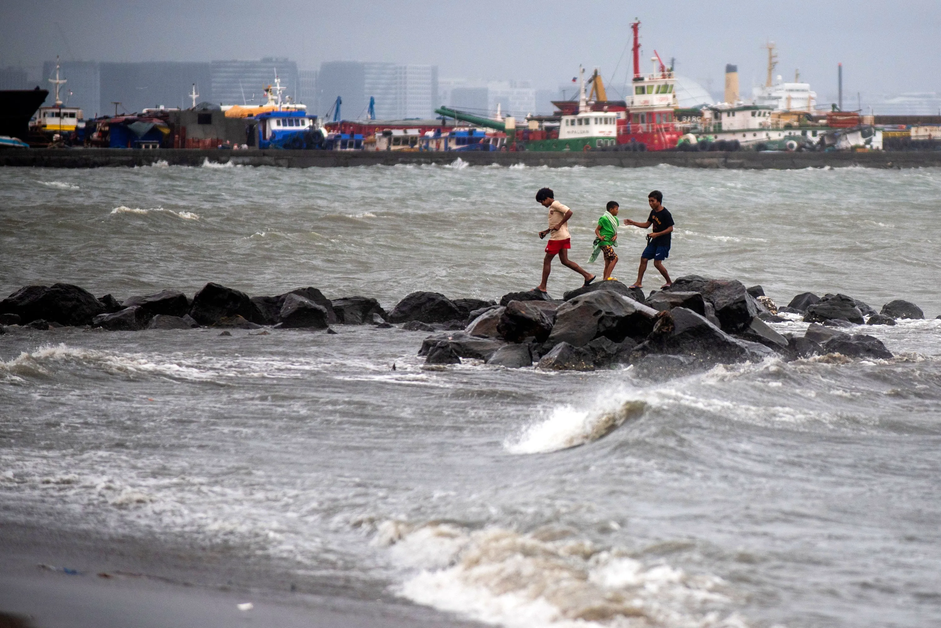 People prepare to leave the beach following heavy rains brought by the Tropical Storm Nalgae (Paeng) in Manila, Philippines on October 29, 2022. (Photo by Lisa Marie David/Reuters)