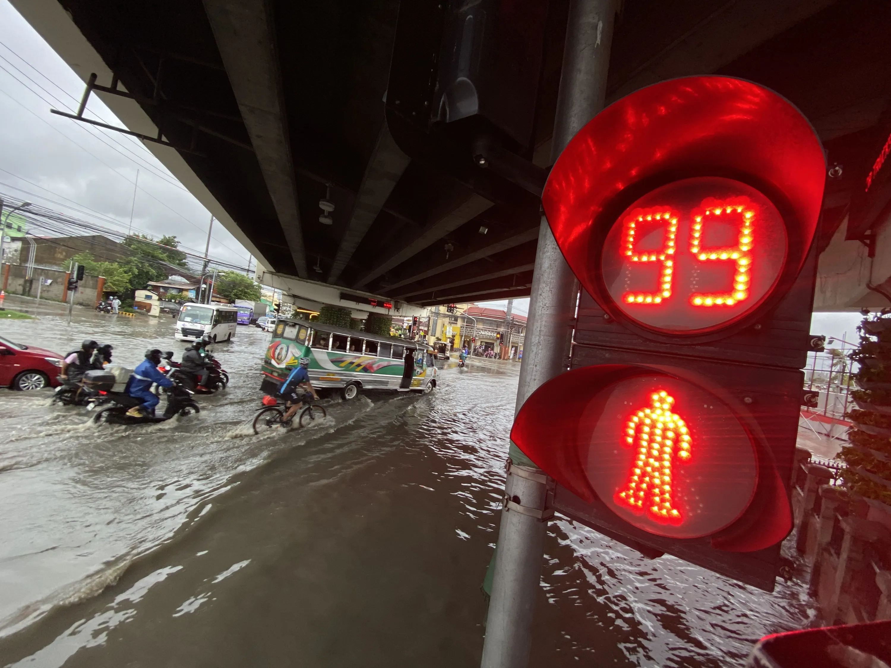 Motorists traverse a flooded road in Las Pinas city, Metro Manila, Philippines, 29 October 2022. Data from the National Disaster Risk Reduction and Management Council (NDRRMC) showed that 45 people died from the effects of Typhoon Nalgae as of 29 October. Tracking by the country’s weather bureau places the typhoon in the southern Luzon region moving in a west southwestward direction. (Photo by Francis R. Malasig/EPA/EFE)