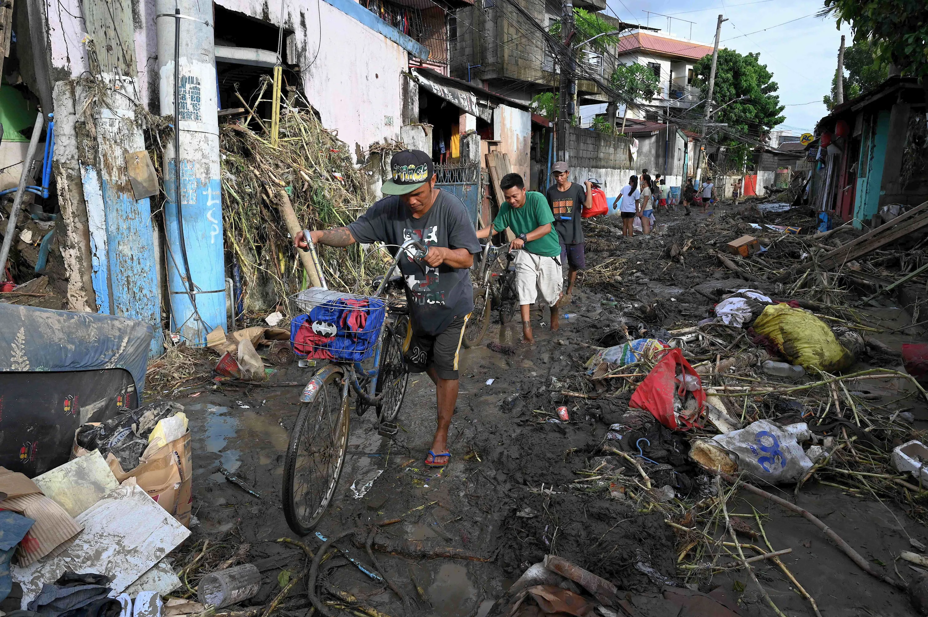 Men carrying their bicyclea as they walk along a debris-covered street in Noveleta, Cavite on October 30, 2022, a day after Tropical Storm Nalgae hit. Emergency workers scrambled to rescue residents trapped by floods in and around the Philippine capital on October 30 as Tropical Storm Nalgae swept out of the country after killing at least 48 people. (Photo by Jam Sta Rosa/AFP Photo)