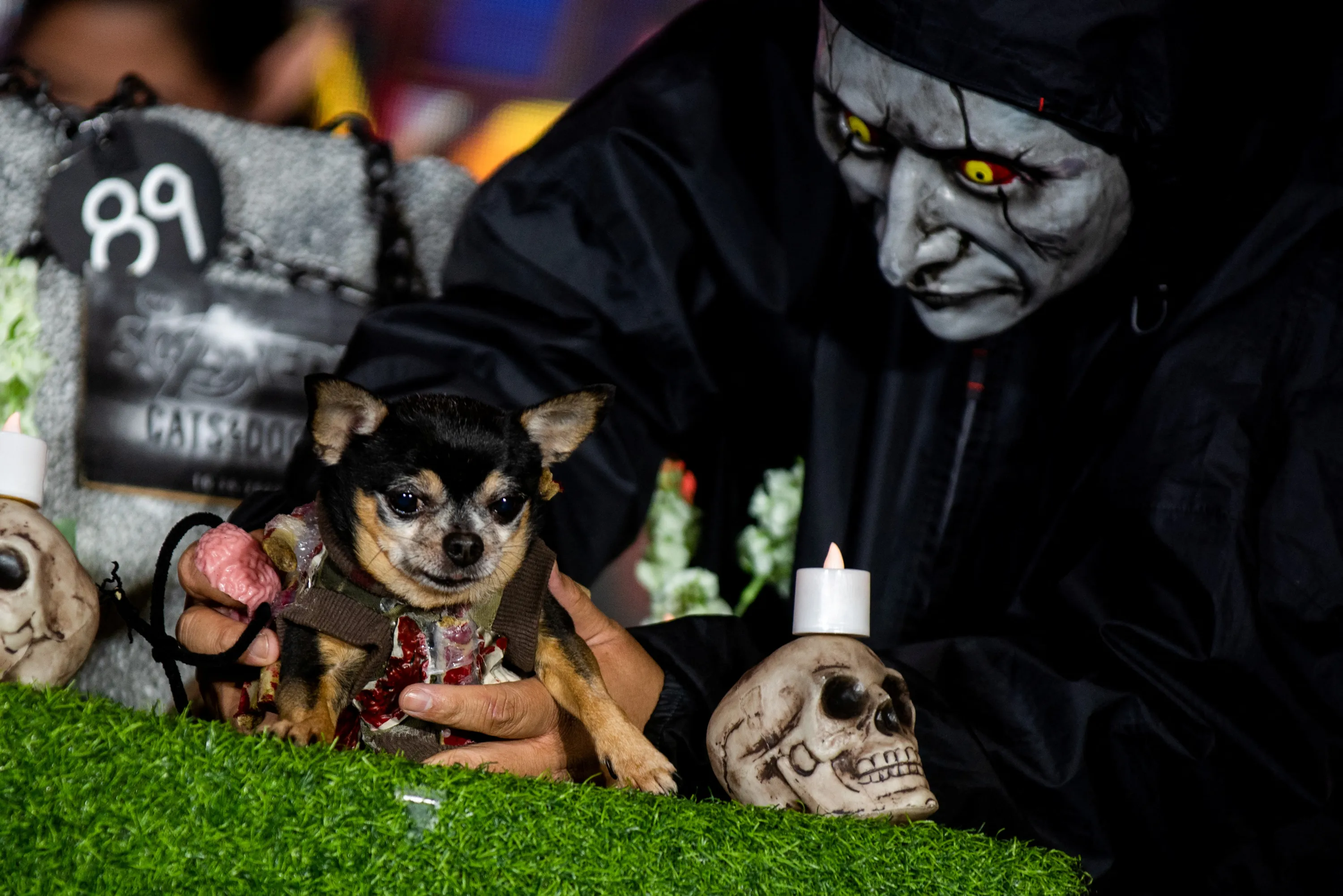 A pet owner holds his dog during a halloween pet costume competition, in Quezon City, Metro Manila, Philippines on October 30, 2022. (Photo by Lisa Marie David/Reuters)
