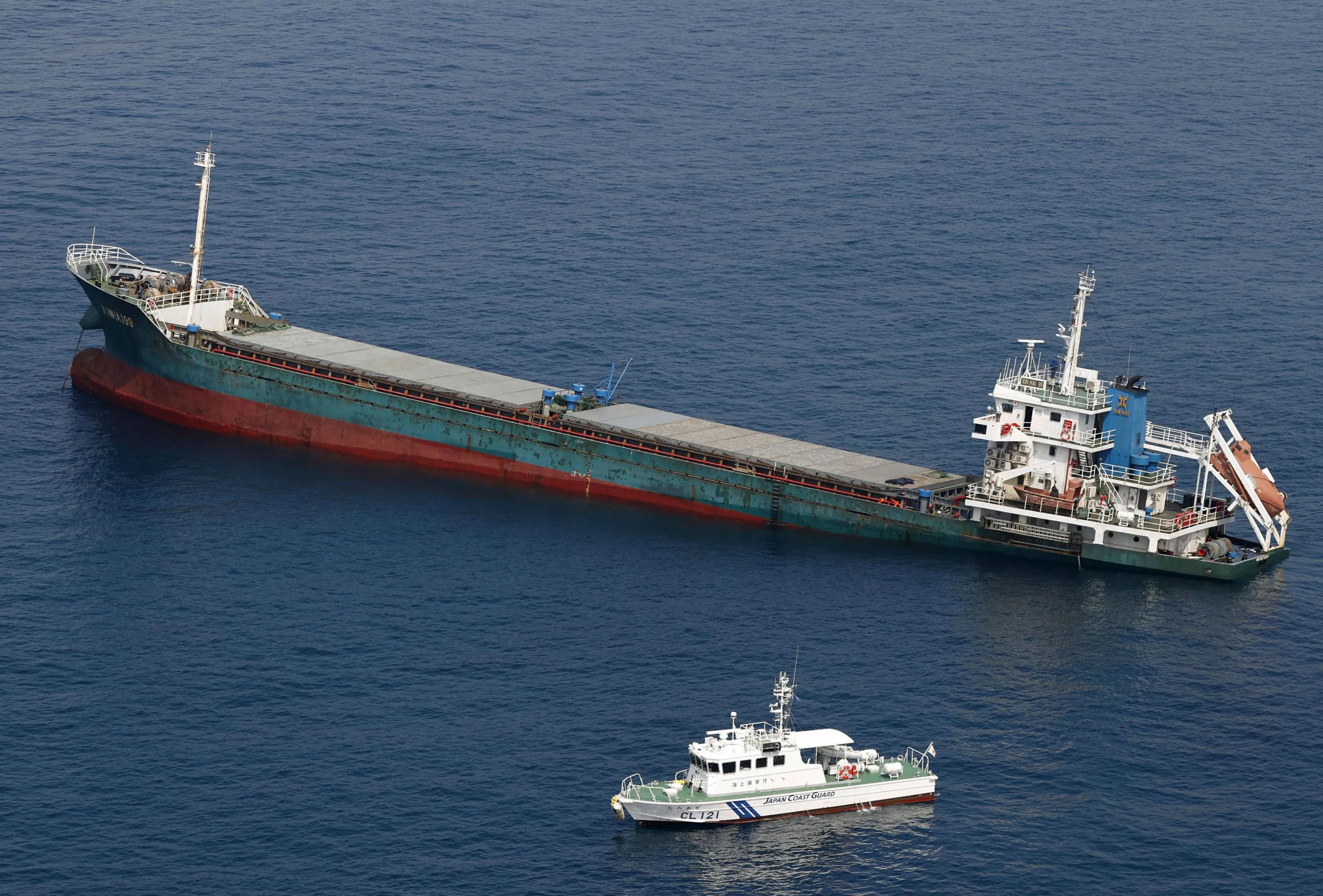 This aerial photo shows Belize-registered cargo ship Xin Hai 99, after a collision, off Kushimoto, Wakayama prefecture, southwestern Japan, Saturday, August 20, 2022. A Japanese chemical tanker ship crashed into the cargo ship off the coast of southwestern Japan, the coast guard said Saturday. (Photo by Kyodo News via AP Photo)