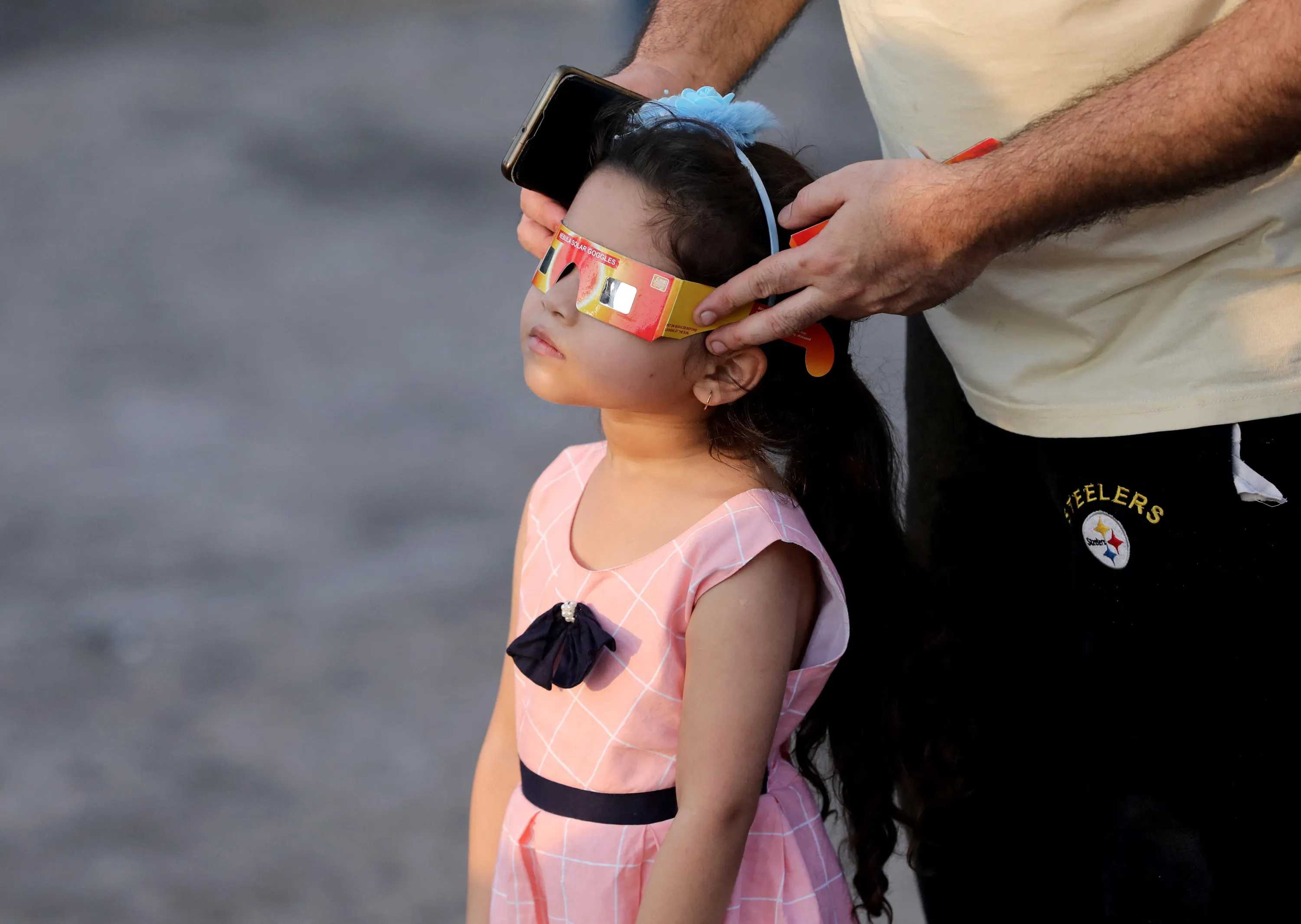 A girl uses solar viewers to watch a partial solar eclipse in Mumbai, India on October 25, 2022. (Photo by Niharika Kulkarni/Reuters)