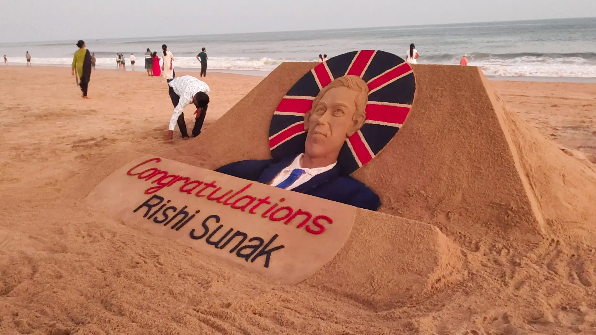 Sand sculpture of Britain's new Prime Minister Rishi Sunak built at Puri Beach in India's Odisha on October 25, 2022. (Photo by Sandeep Kumar/Anadolu Agency via Getty Images)