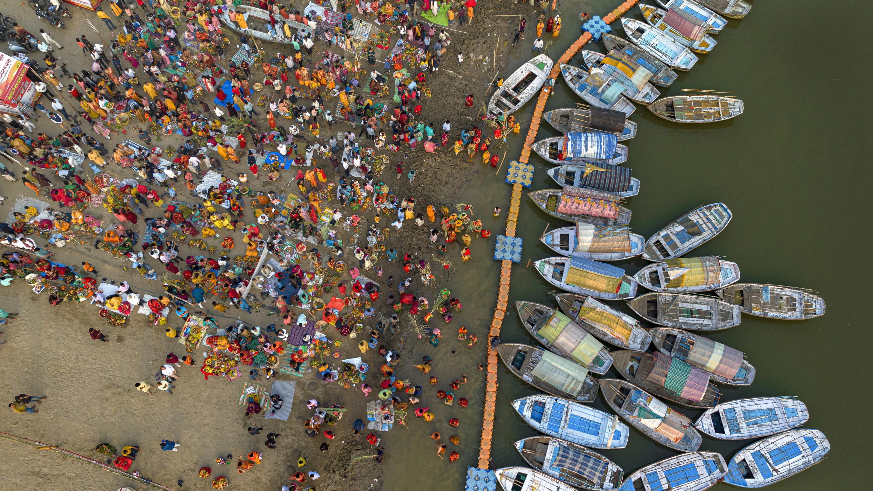 Hindu devotees gather to perform rituals to the Sun god during Chhath Puja festival at Sangam, the confluence of rivers the Ganges and the Yamuna in Prayagraj, in the northern state of Uttar Pradesh, India, Sunday, October 30, 2022. During Chhath, an ancient Hindu festival, rituals are performed to thank the Sun god for sustaining life on earth. (Photo by Rajesh Kumar Singh/AP Photo)