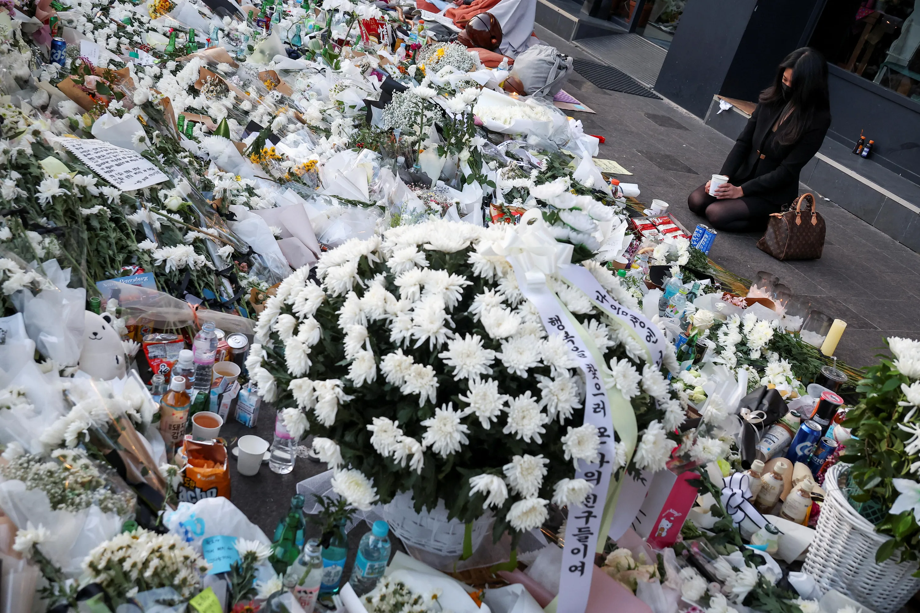 A woman kneels next to floral tributes near the site of a crowd crush that happened during Halloween festivities, in Seoul, South Korea on November 2, 2022. (Photo by Kim Hong-Ji/Reuters)