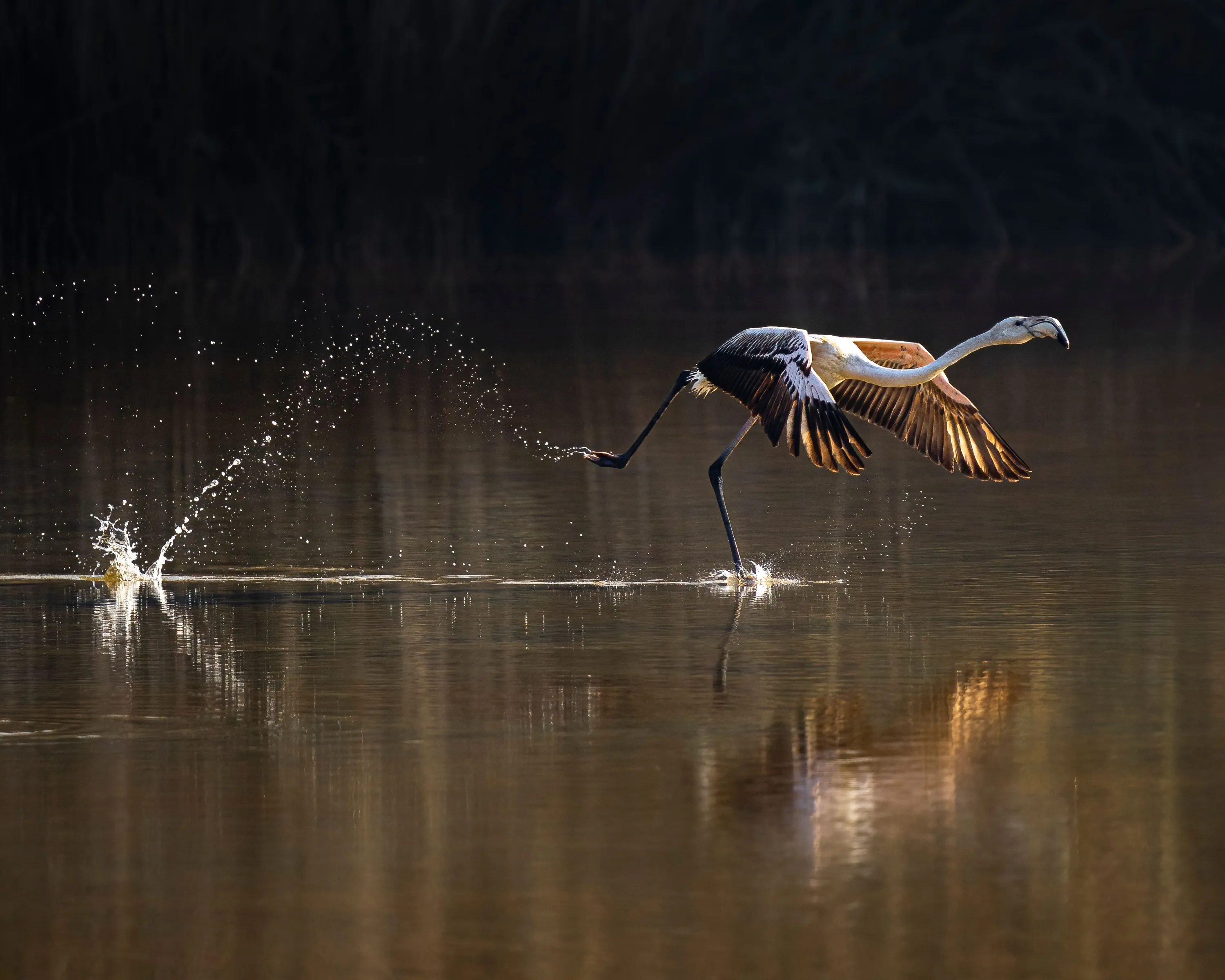 Mangroves & Wildlife Winner. Take off by Jayakumar MN, UAE. A greater flamingo (Phoenicopterus roseus) takes off on a migration journey across Asia, and will most likely return to the same coastal wetlands in the winter months. “It was feeding with its head in the water, before flying off into the morning light”. (Photo by Jayakumar MN/Mangrove Photographer of the Year)