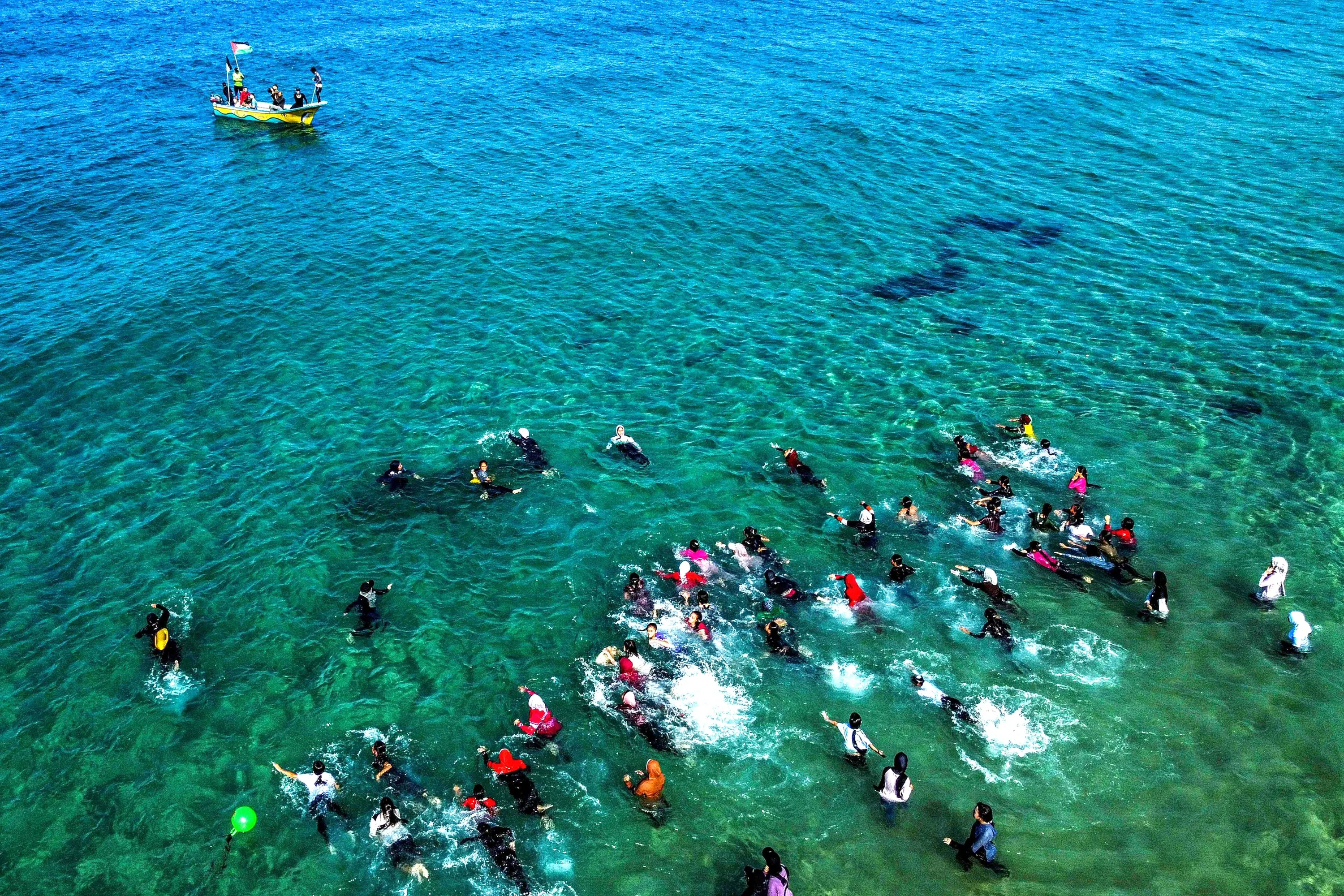 This picture taken on November 3, 2022 shows an aerial view of Palestinian girls taking part in a swimming festival in the Mediterranean sea waters off of Beit Lahia in the northern Gaza Strip. (Photo by Mahmud Hams/AFP Photo)