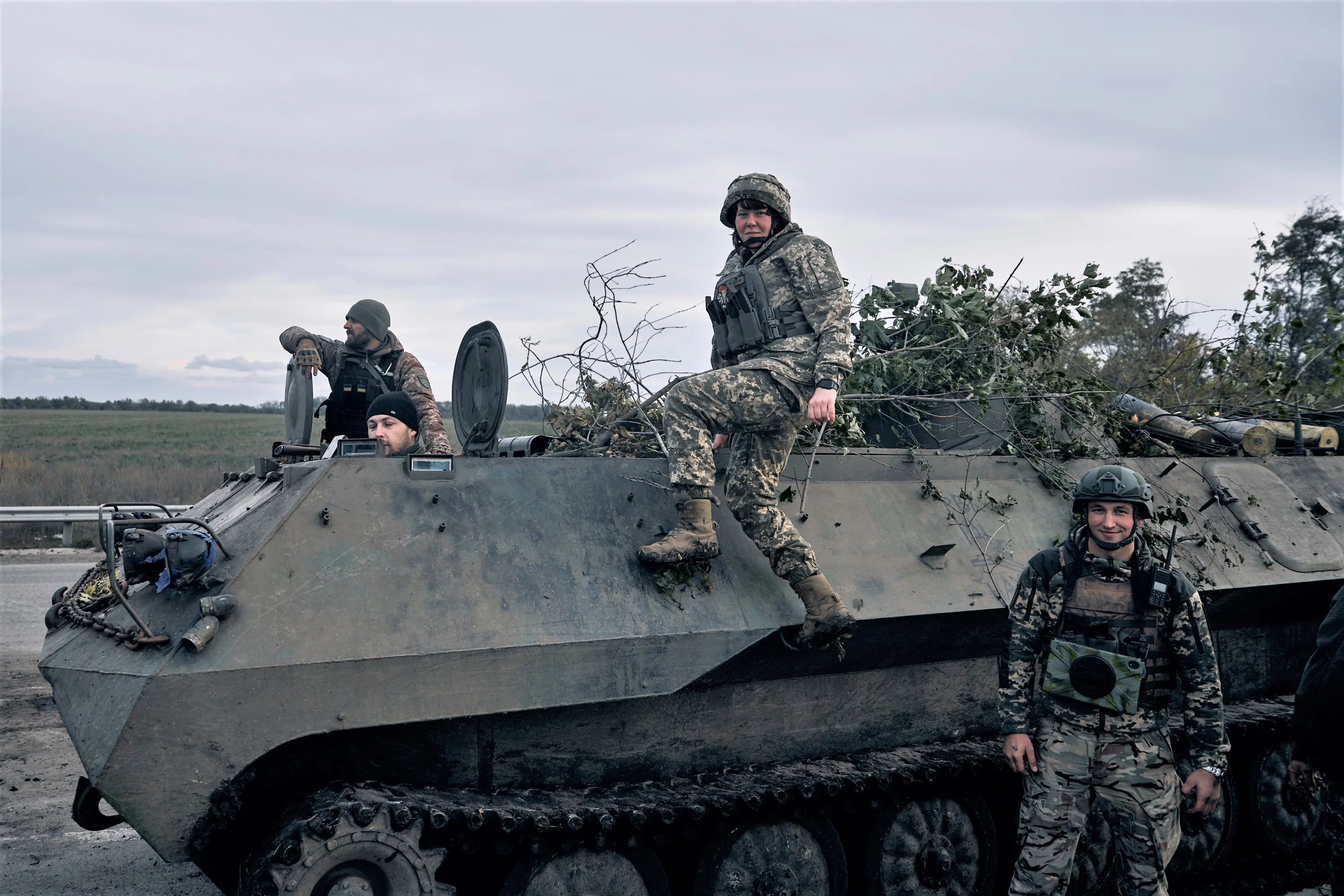 Ukrainian servicemen and a servicewoman, center, pose for a photo with their armored vehicle near Bakhmut, Donetsk region, Ukraine, Saturday, October 22, 2022. (Photo by LIBKOS/AP Photo)