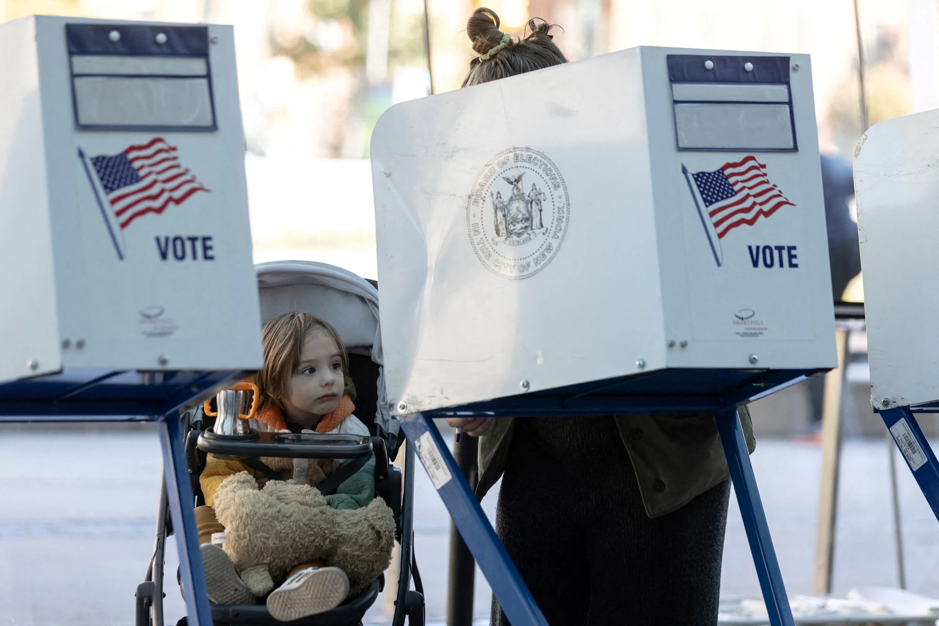 A girl watches her mother casting her ballot during early voting at the Brooklyn Museum in Brooklyn, New York City, U.S., October 29, 2022. (Photo by Jeenah Moon/Reuters)