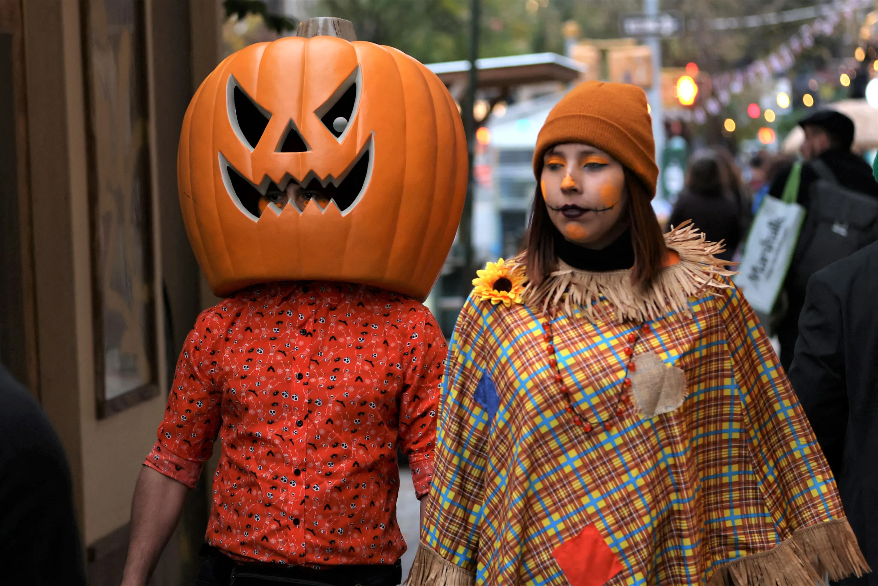 People in costumes walk through the West Village on Halloween in Manhattan, New York City, U.S., October 31, 2022. (Photo by Andrew Kelly/Reuters)