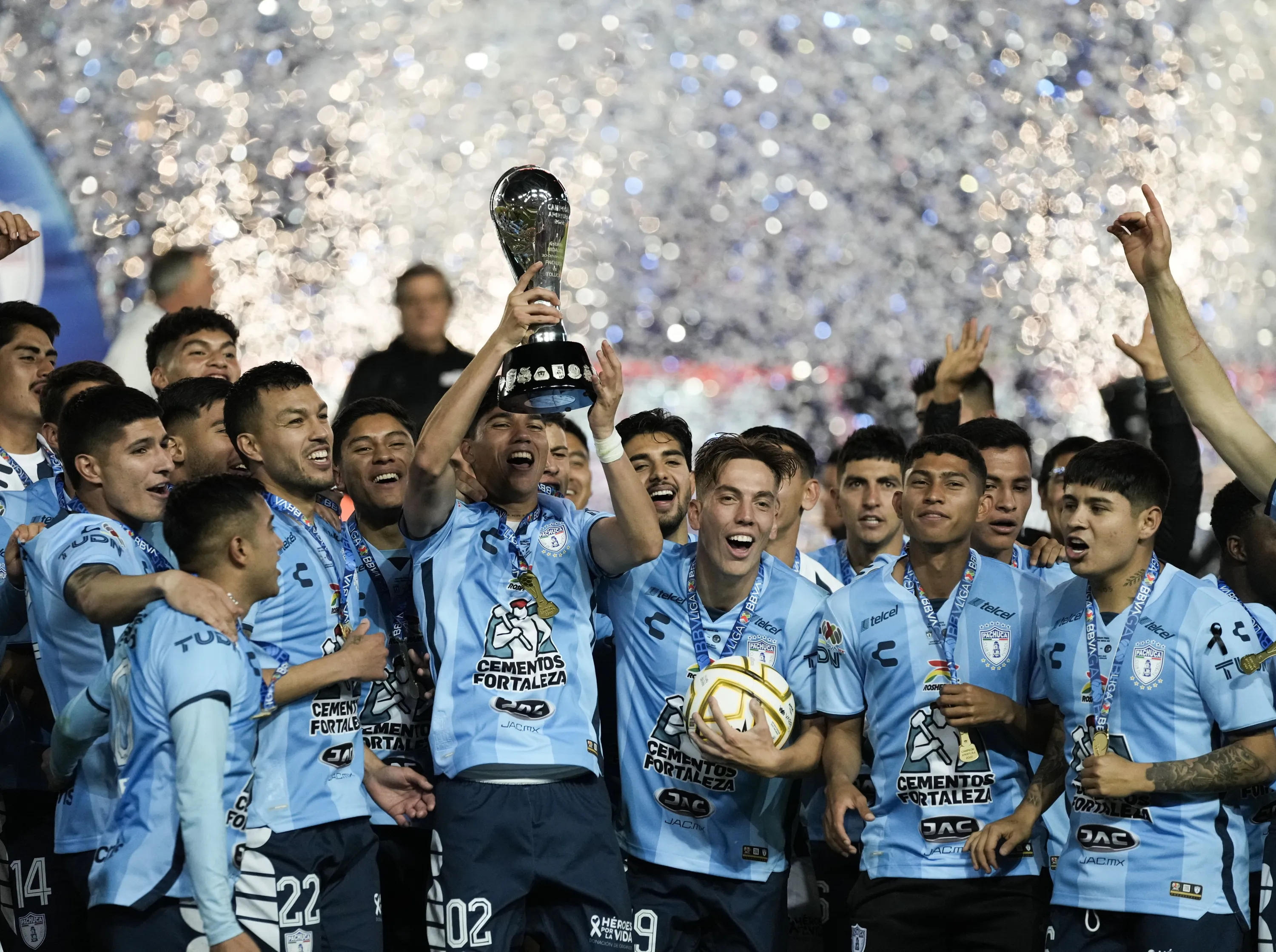 Pachuca players celebrate their victory over Toluca in the Mexican soccer league title match, in Pachuca, Mexico, Sunday, October 30, 2022. (Photo by Moises Castillo/AP Photo)