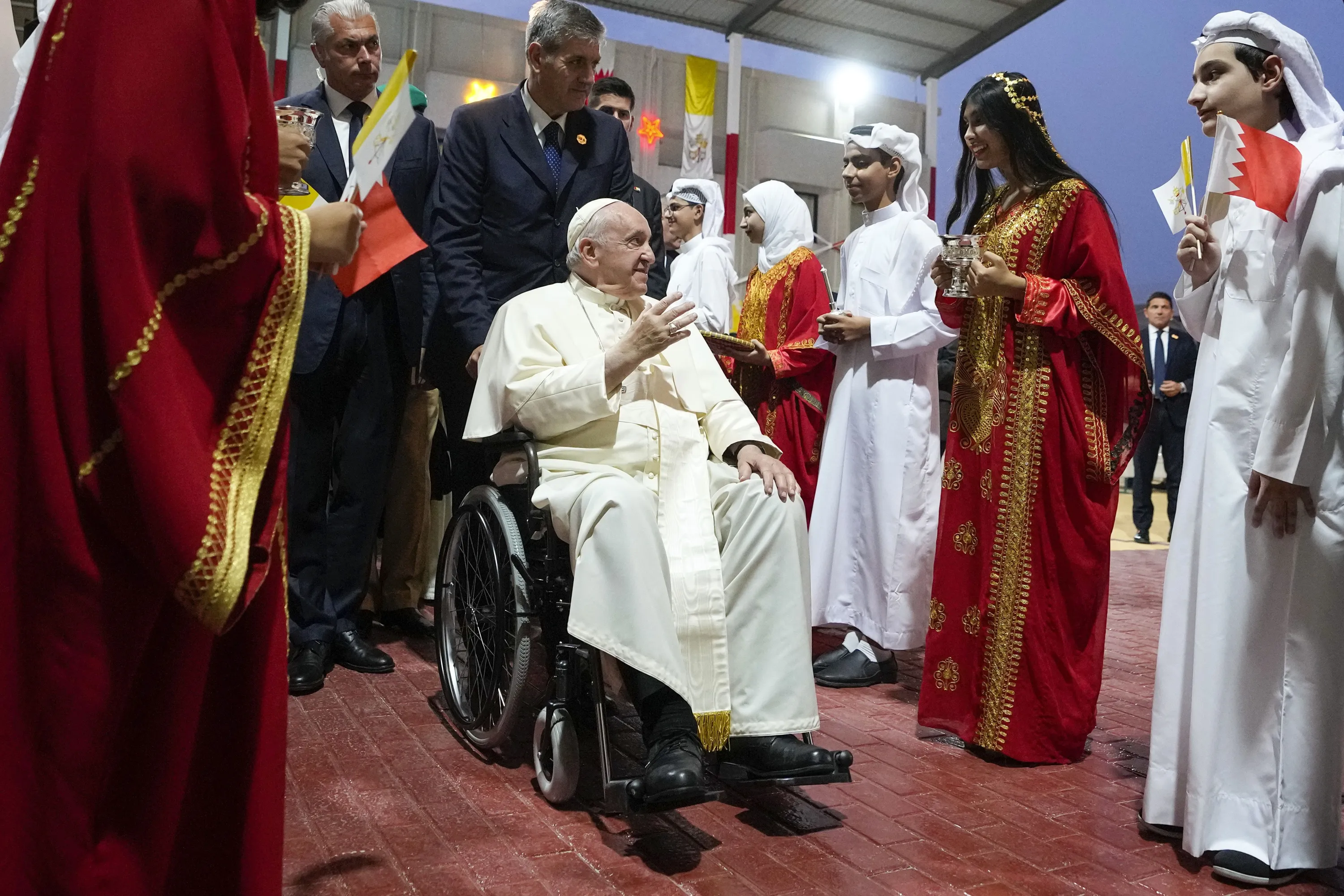 Pope Francis arrives for a meeting with the youth at the Sacred Heart School in Manama, Bahrain, Saturday, November 5, 2022. Pope Francis is making the November 3-6 visit to participate in a government-sponsored conference on East-West dialogue and to minister to Bahrain's tiny Catholic community, part of his effort to pursue dialogue with the Muslim world. (Photo by Alessandra Tarantino/AP Photo)